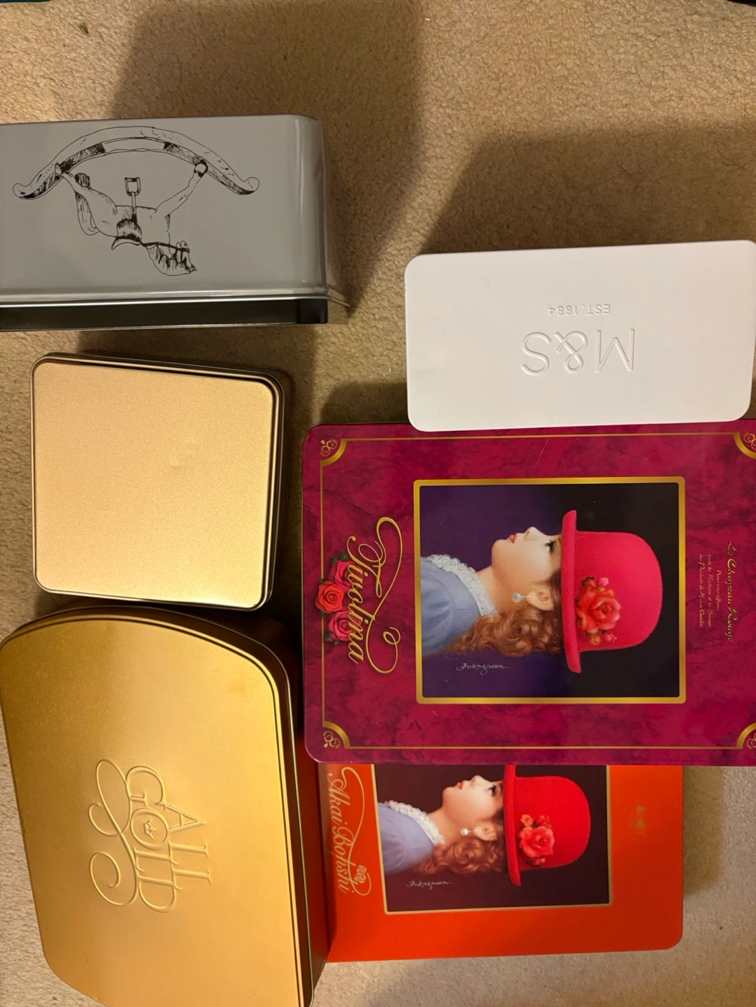 Assortment of decorative metal tins. Various sizes and designs. Some tins feature illustrations and embossed text. Ideal for storage or collecting. No rust