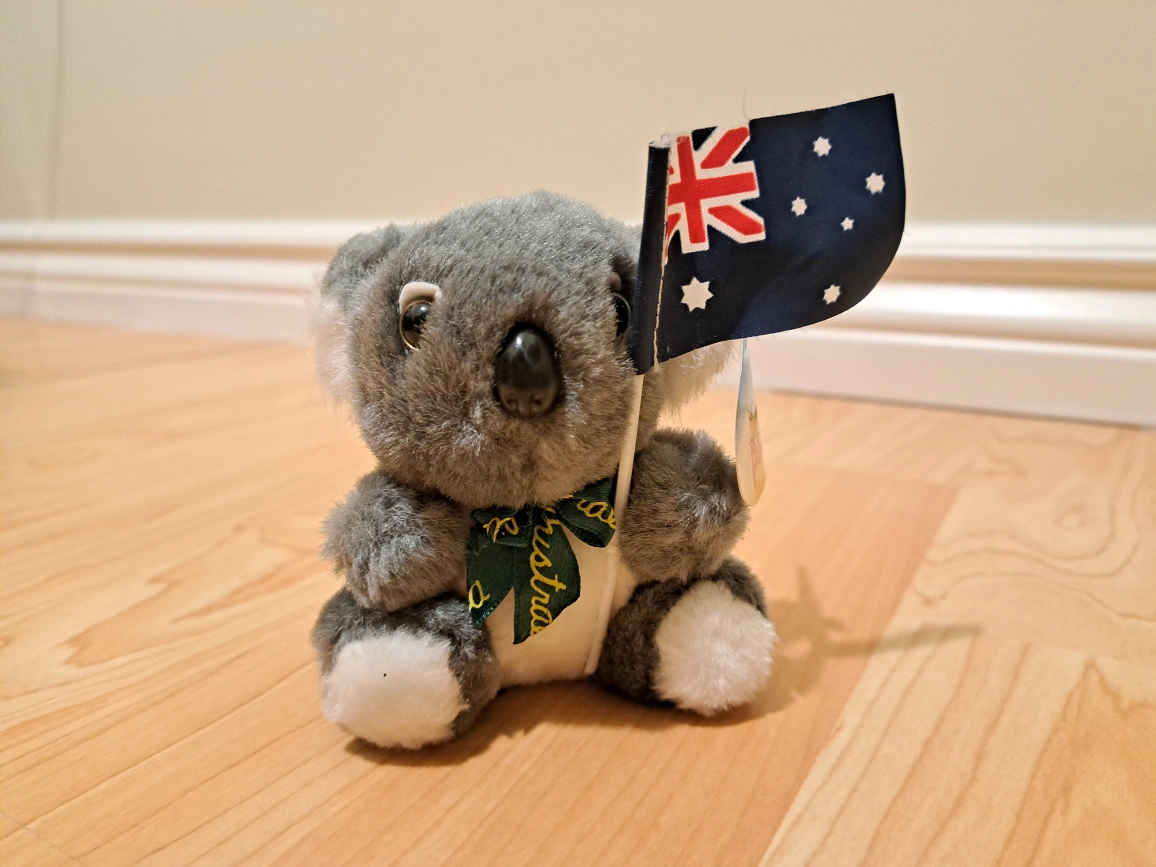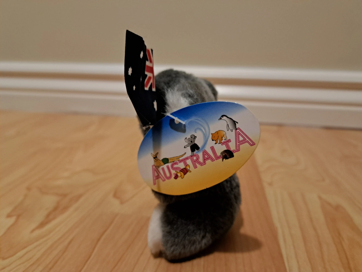 Small grey koala plush toy. Holds a miniature Australian flag. Designed in Australia. Hand-made in China. Perfect souvenir or gift.