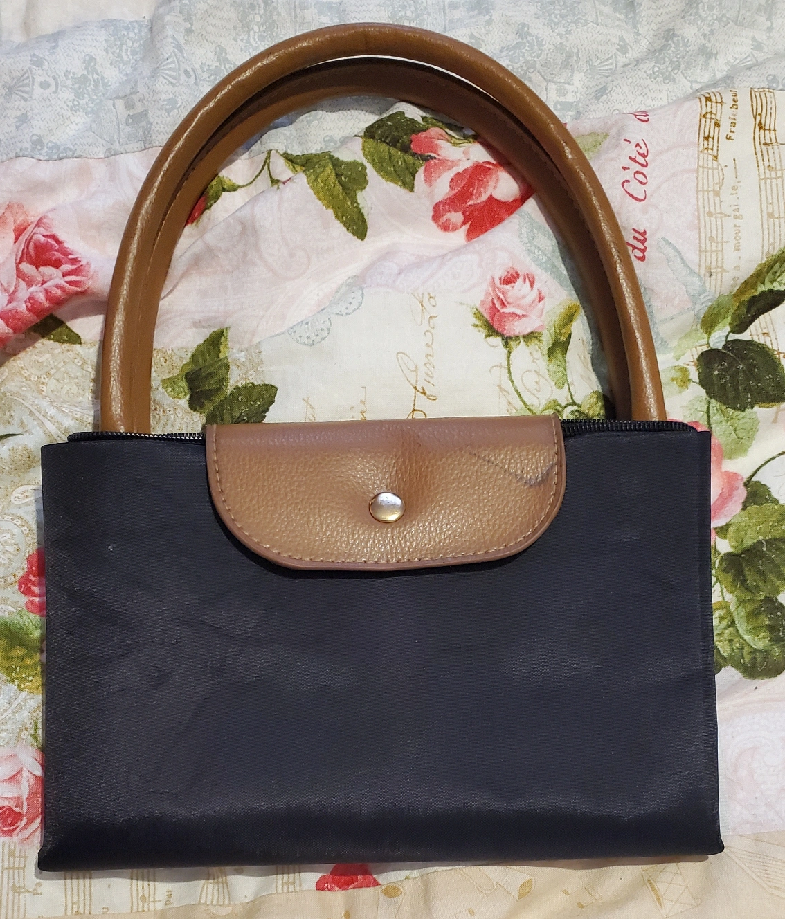 Foldable nylon tote bag. Features tan leatherette handles and a small flap pocket. Great for shopping or everyday use. Compact and lightweight. SFPF HOME Looking for fastest pick up. Delivery not available. Brimley & Eglinton for pick up. No returns.