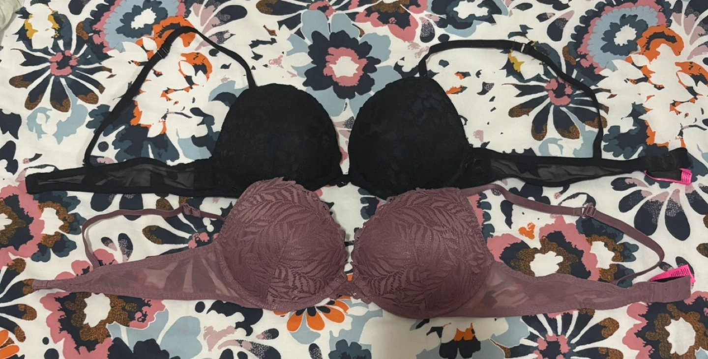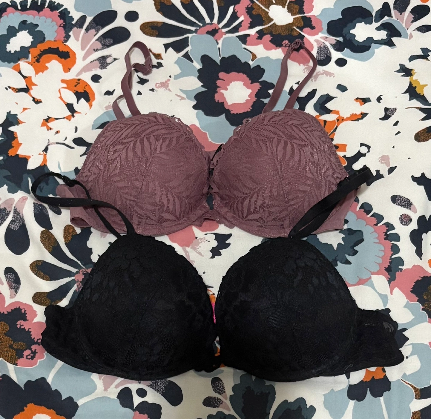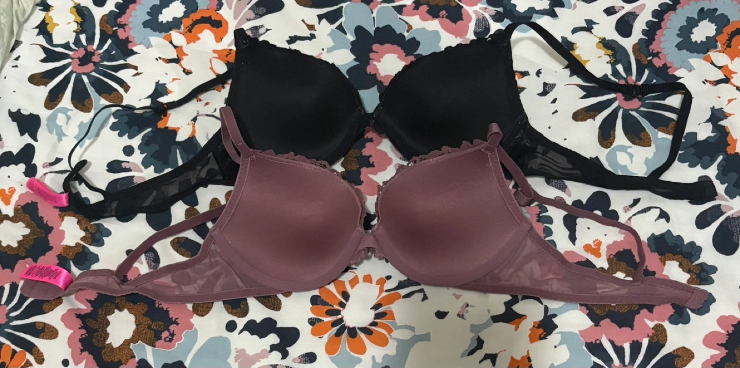 Two bras, one black and one mauve. Lace detail. Adjustable straps. In good condition. Both for $8 Reason for selling- I don’t wear underwired bras anymore.😊
