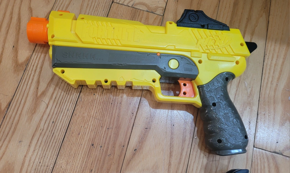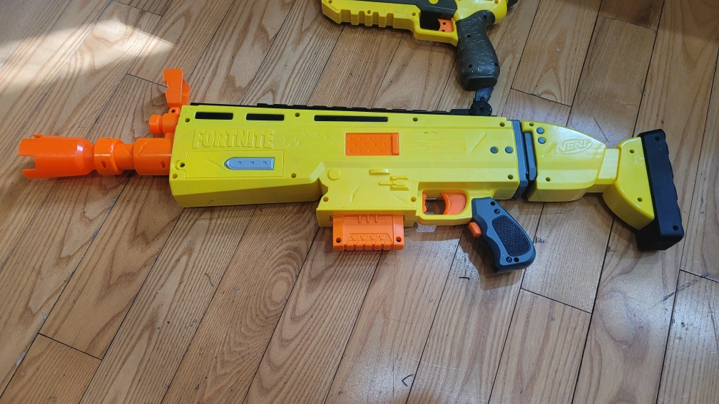 Two Fortnite NERF blasters. Yellow and black colour scheme. One is a larger rifle, the other is a smaller pistol. Good condition.