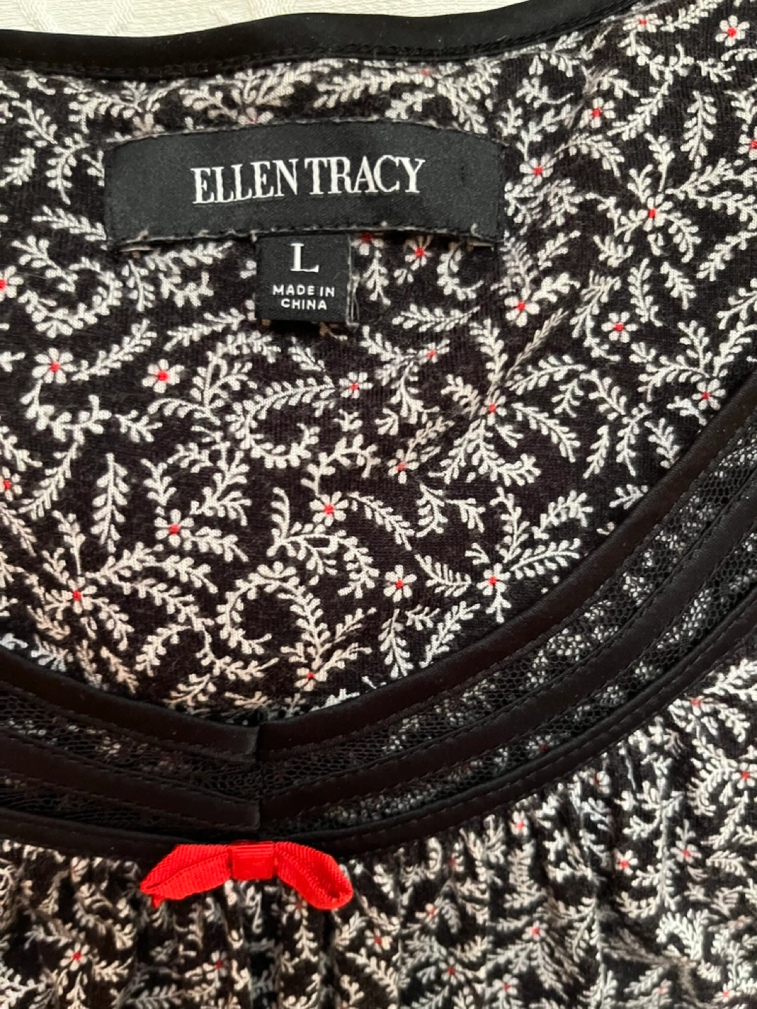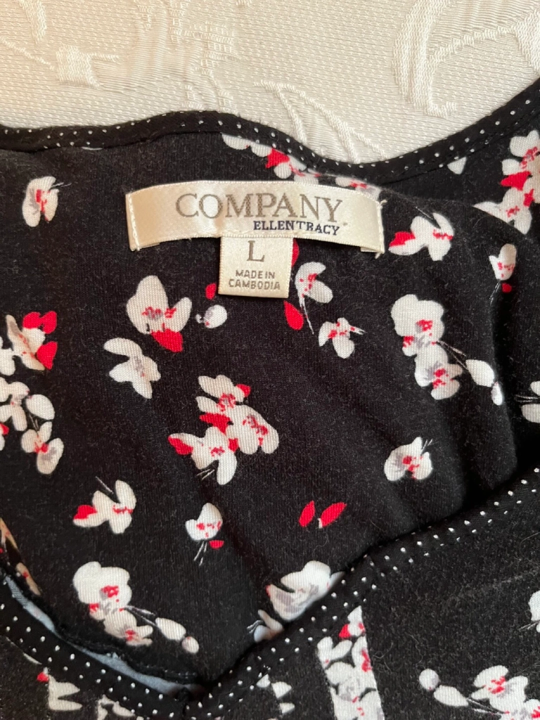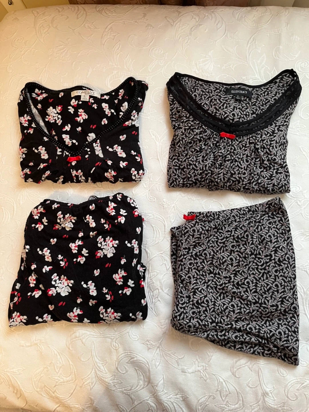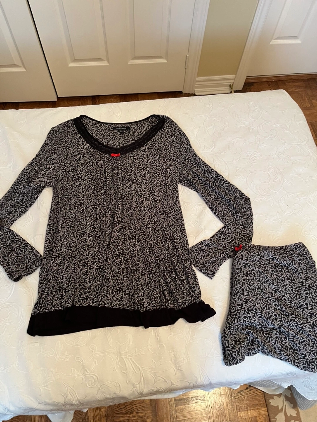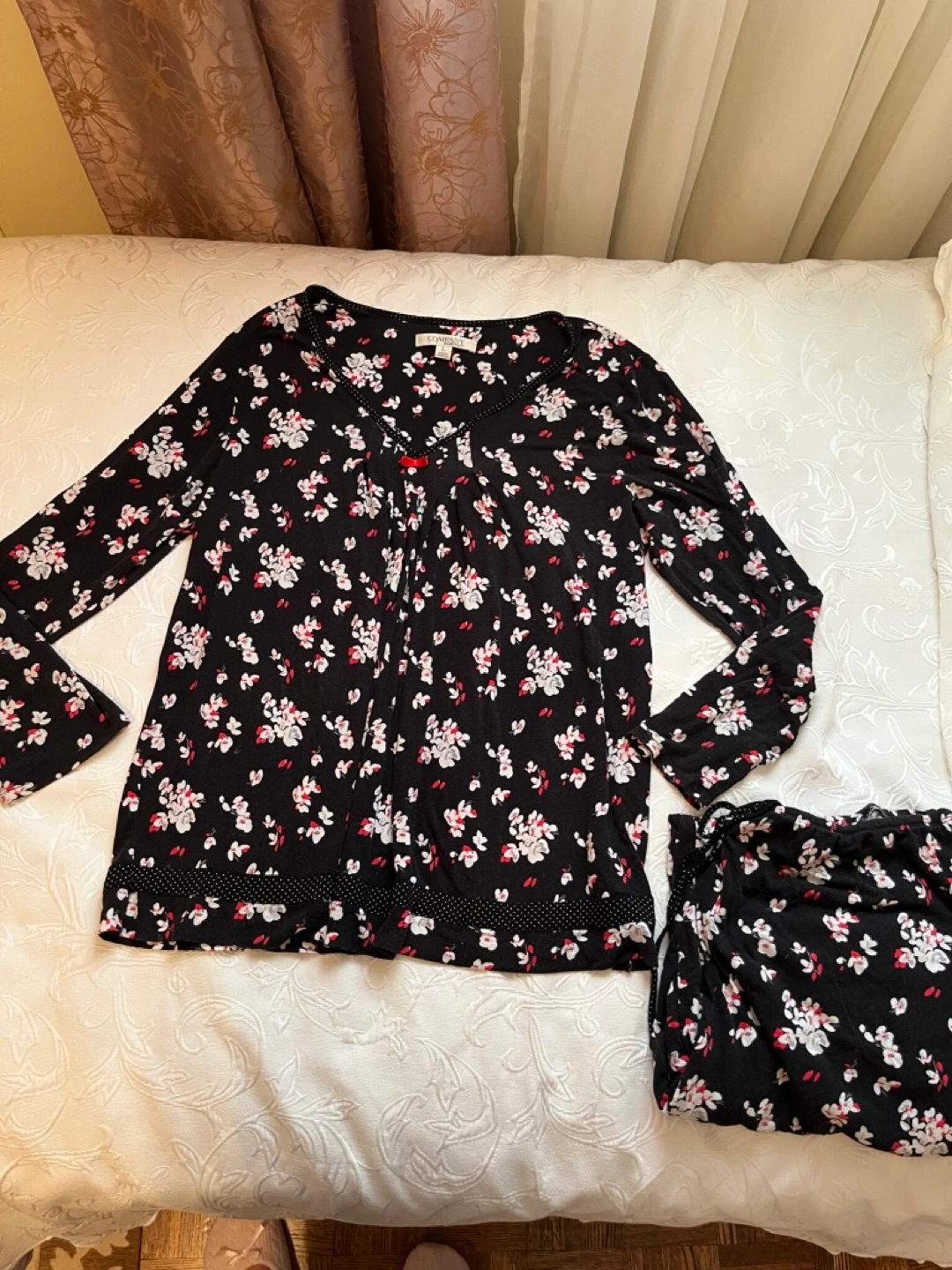 Women's pajama set. Size large. Long sleeves. Black background with white and red floral print. Includes top and bottoms. Used in good condition Cash only