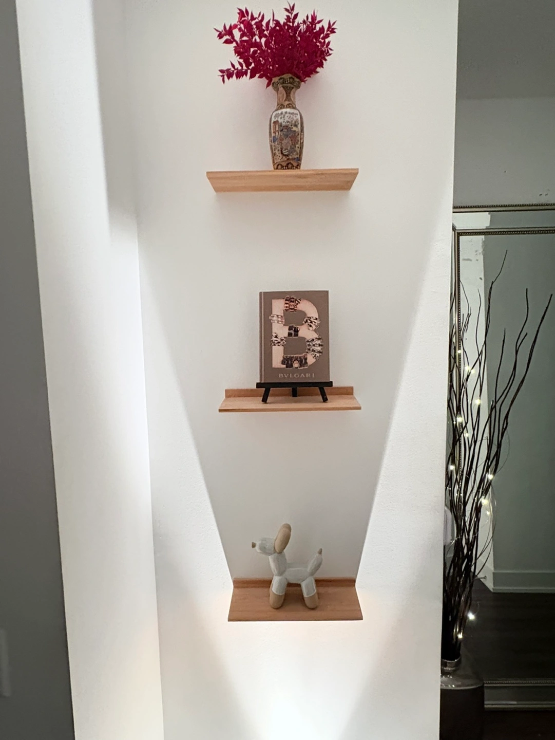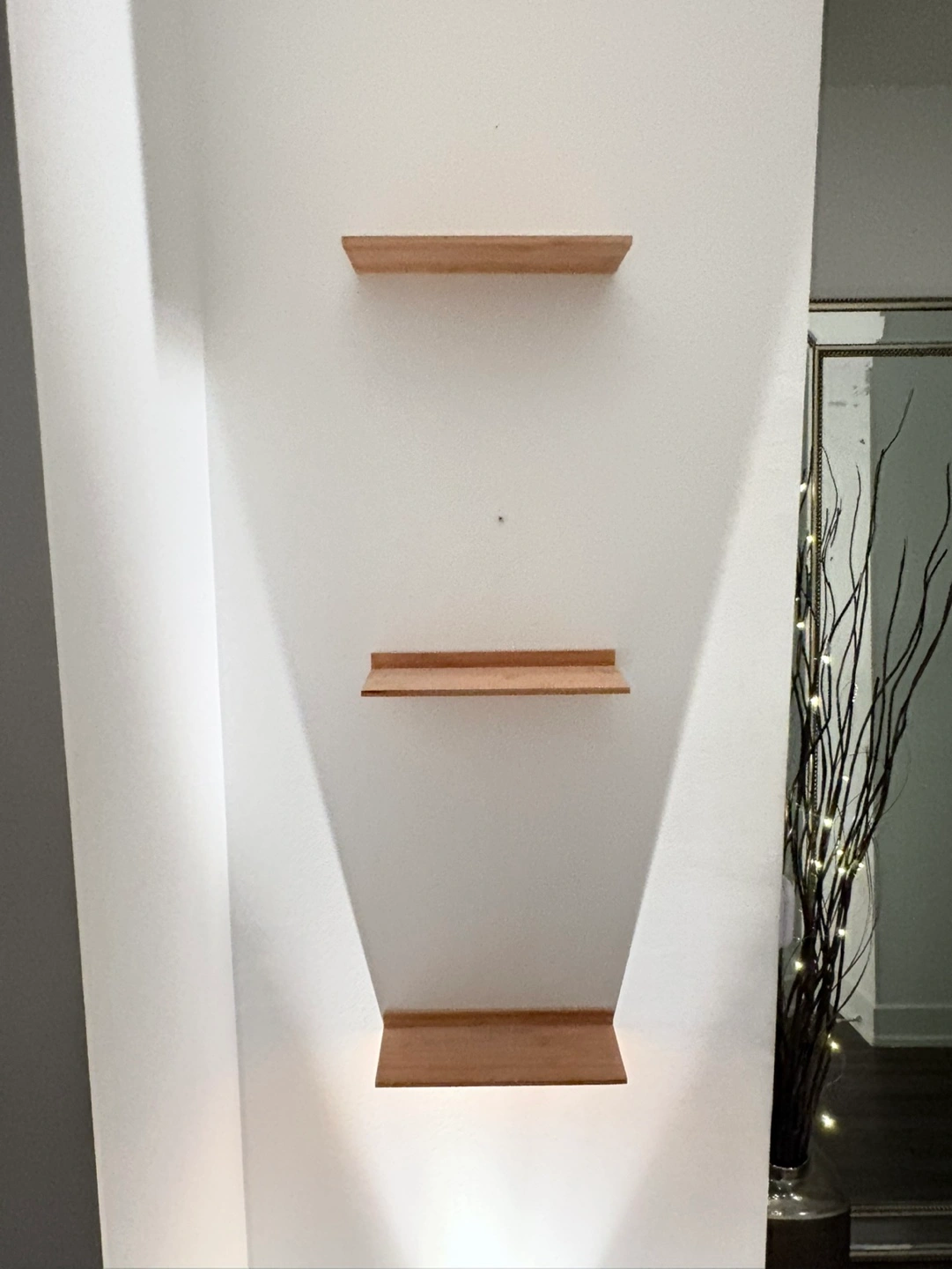 Beautiful and minimal set of 3 bamboo floating shelves—perfect for showcasing small décor pieces, candles, or glassware. Warm wood tones, modern silhouette, and easy-to-style design. • Sturdy and secure wall-mount setup • Clean, Scandinavian-inspired look • Light and easy to install Dimensions: approx. 13” W x 4.5” D 🚚Moving—must go ASAP, drop off available