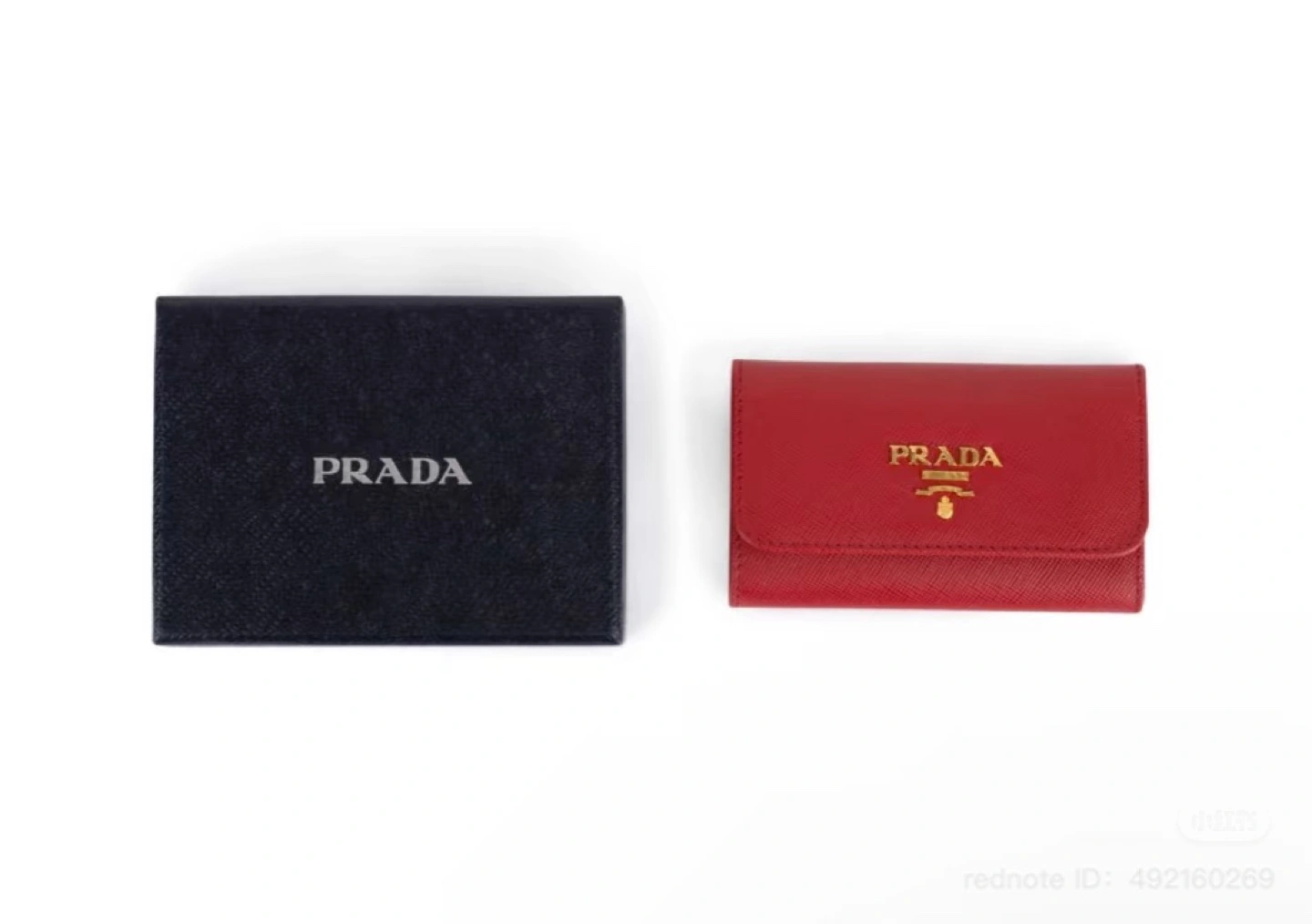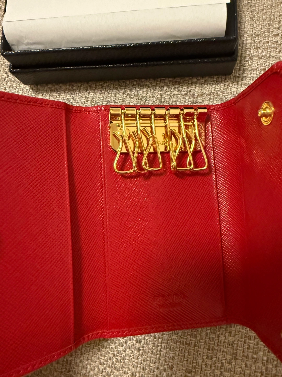 Prada key holder. Red leather. Gold-toned hardware. Includes original box and dust bag. Six key rings.