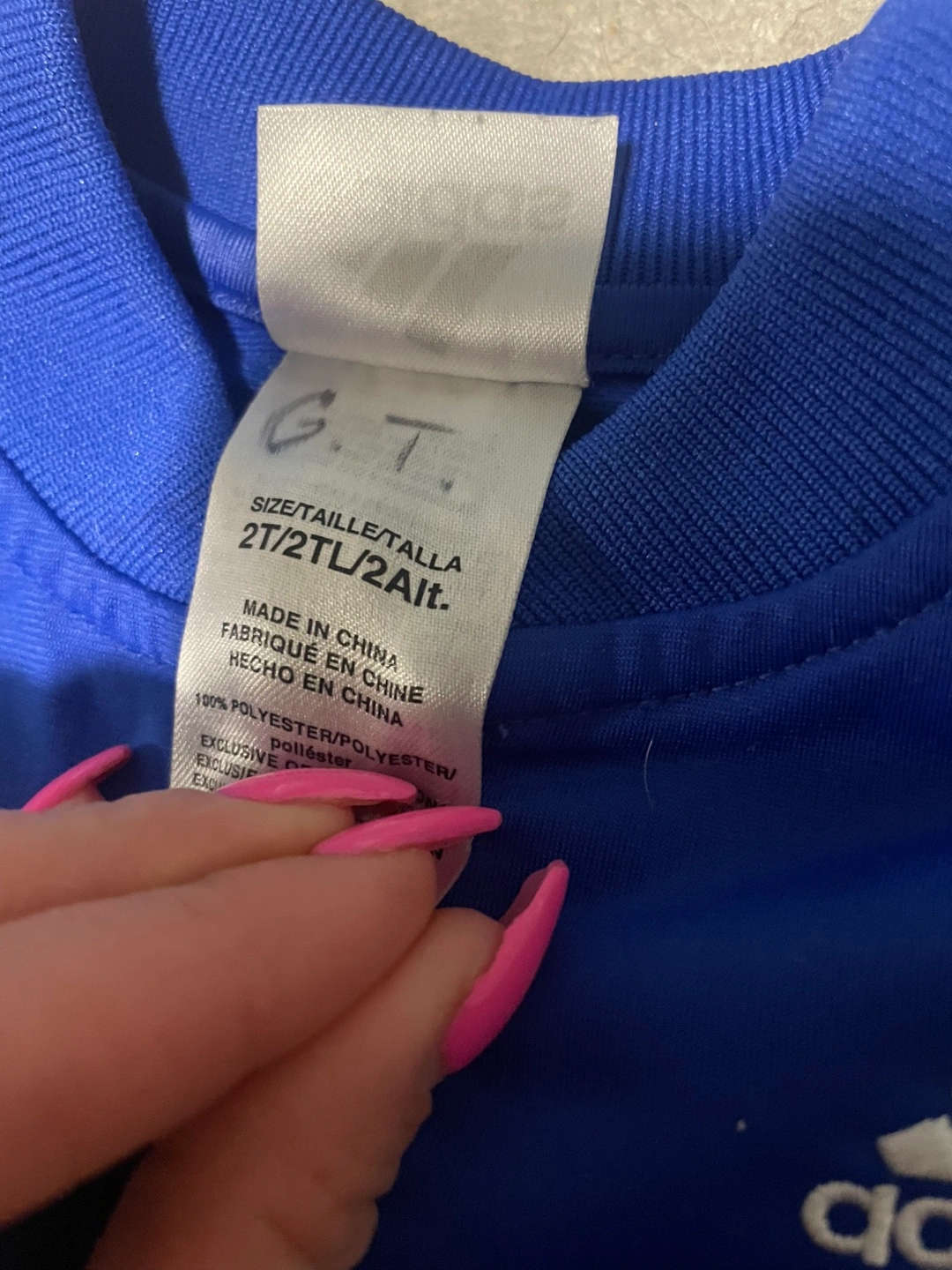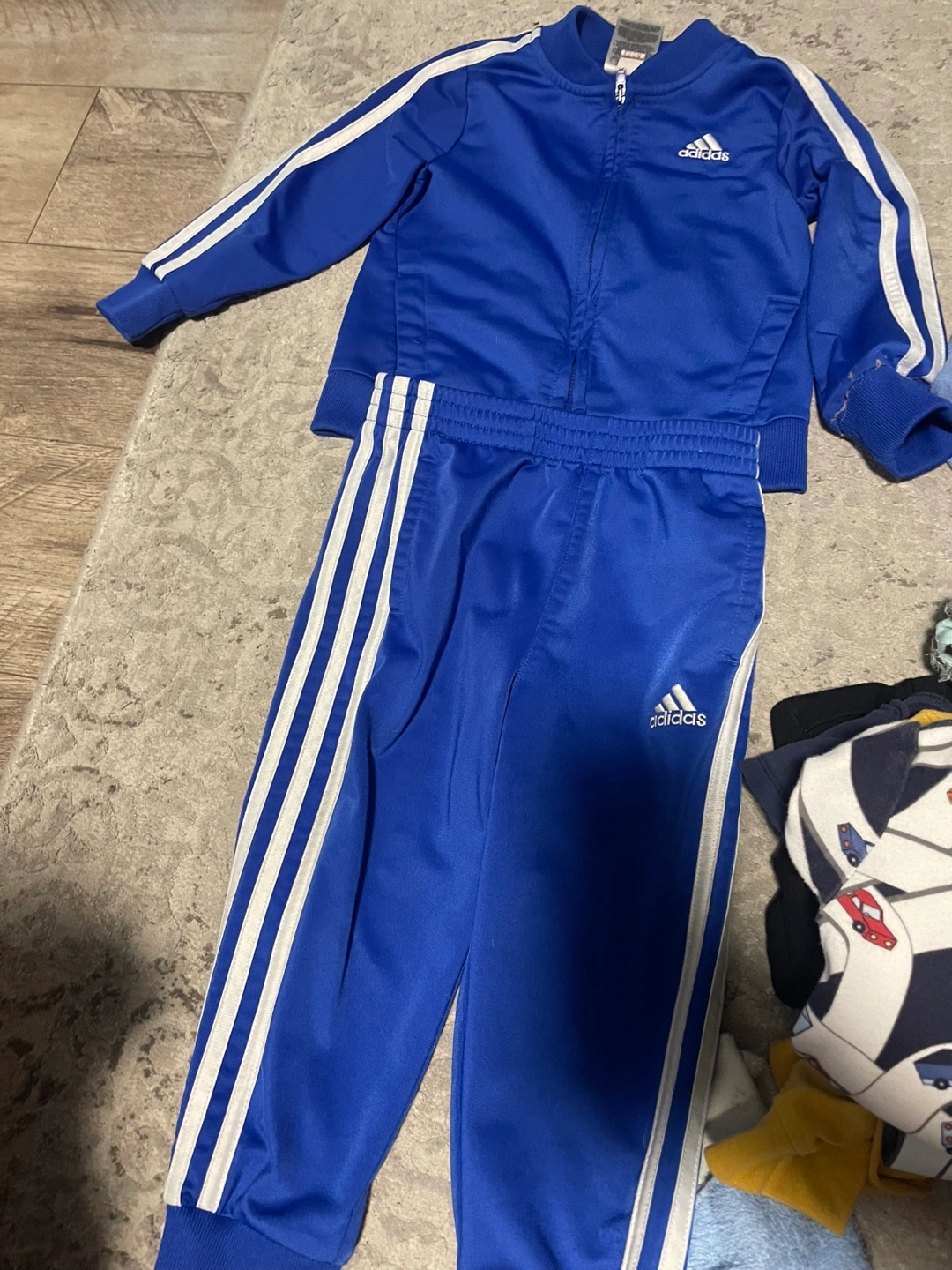 Adorable Adidas tracksuit for baby boys. Size 2T. Blue with white stripes. Zip-up jacket and matching pants. Great for playtime or lounging.