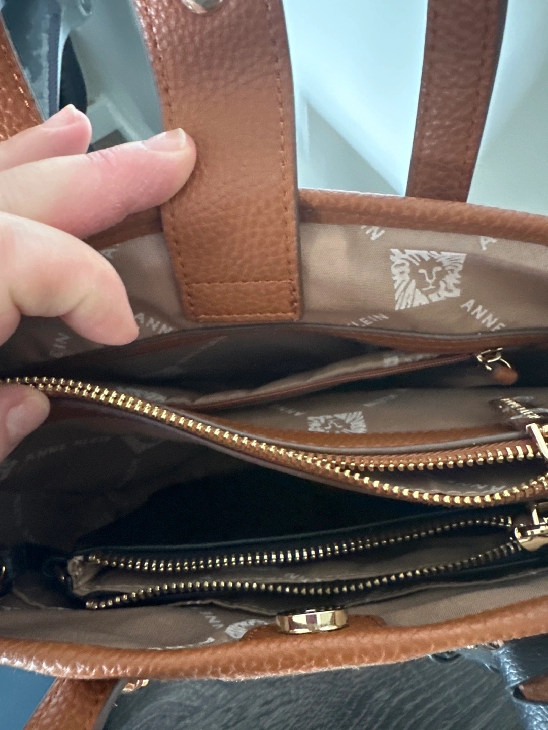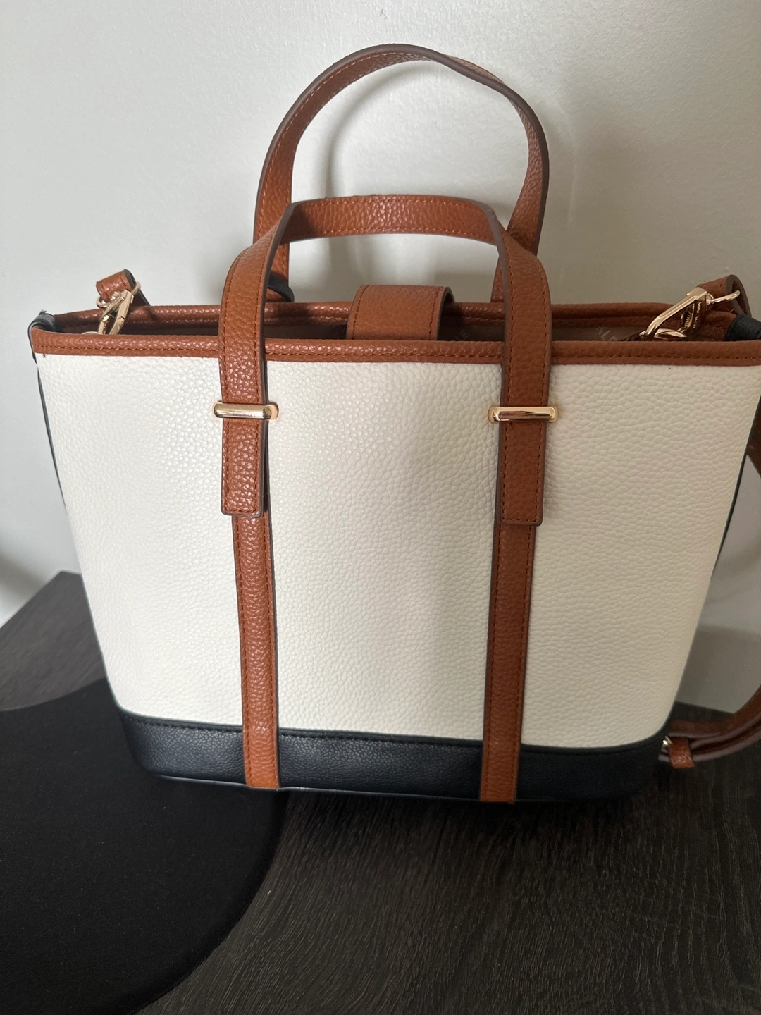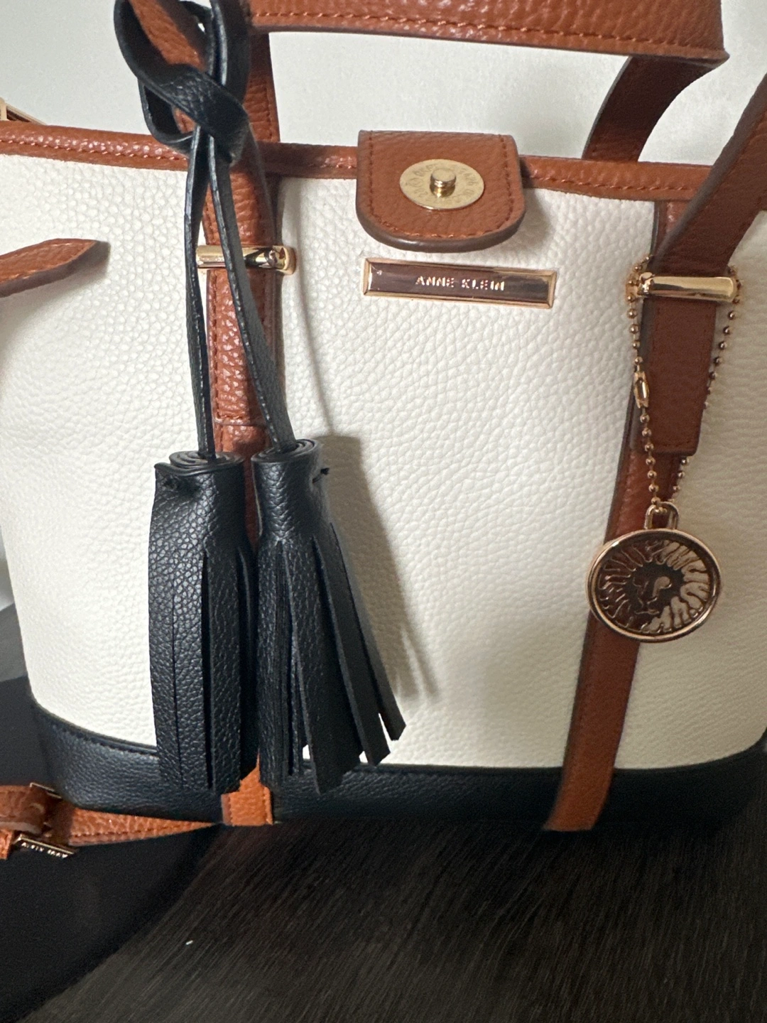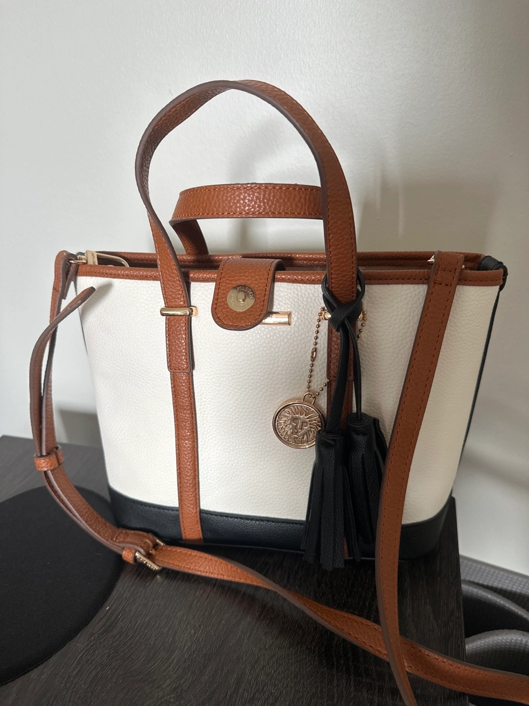Stylish bucket bag. Features two-tone colour scheme, tan and white. Has a crossbody strap and two black tassels. Interior zippered pockets,sell it because I don’t like colour