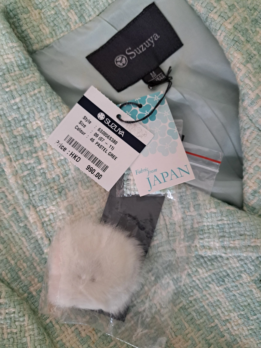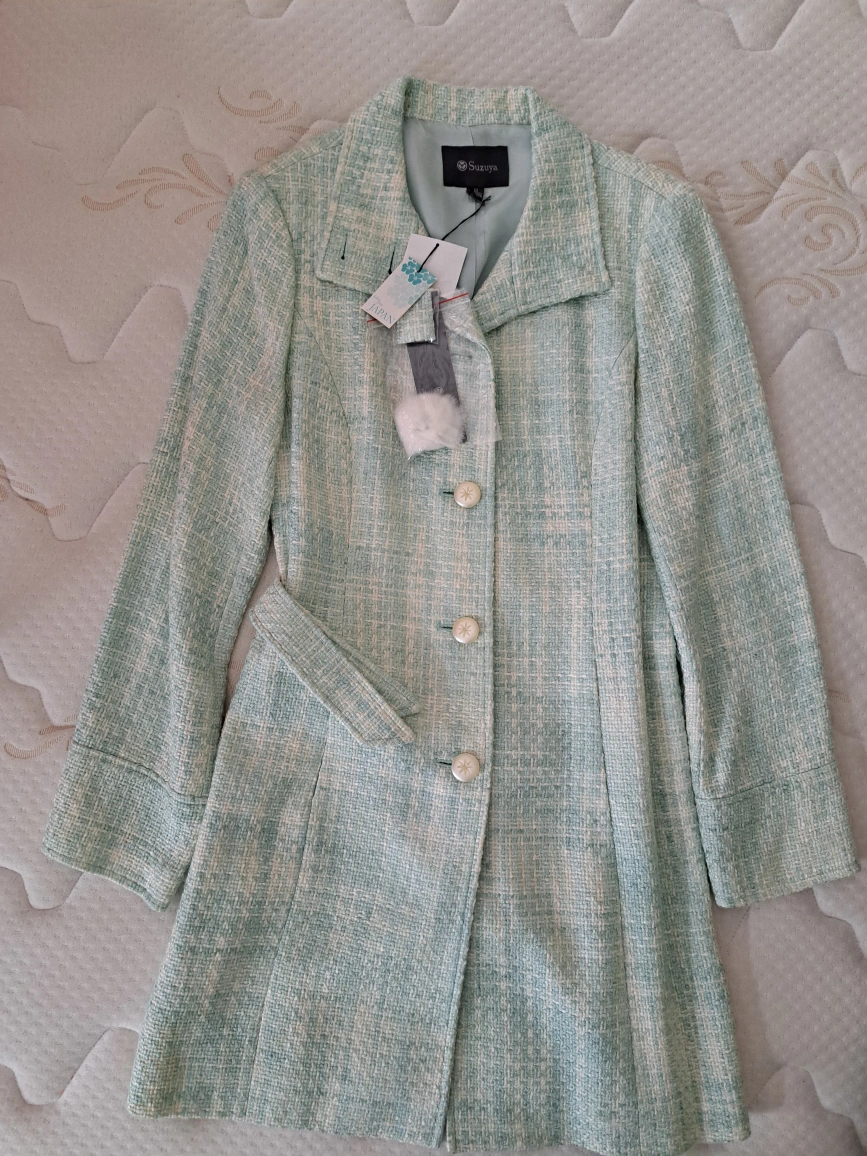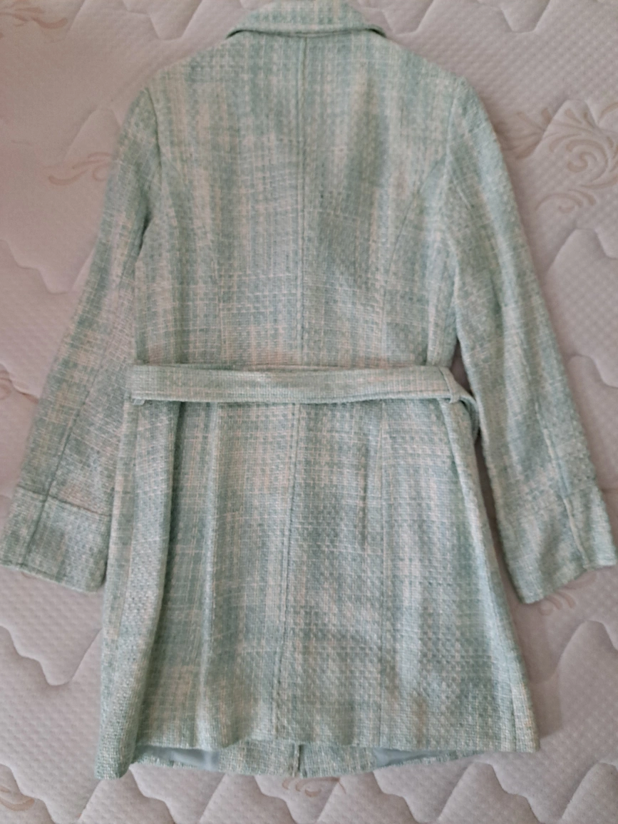 Women's light green tweed jacket. Features a belted waist, collared neckline, and button closure. Long sleeves. Fabric from Japan. Size 09