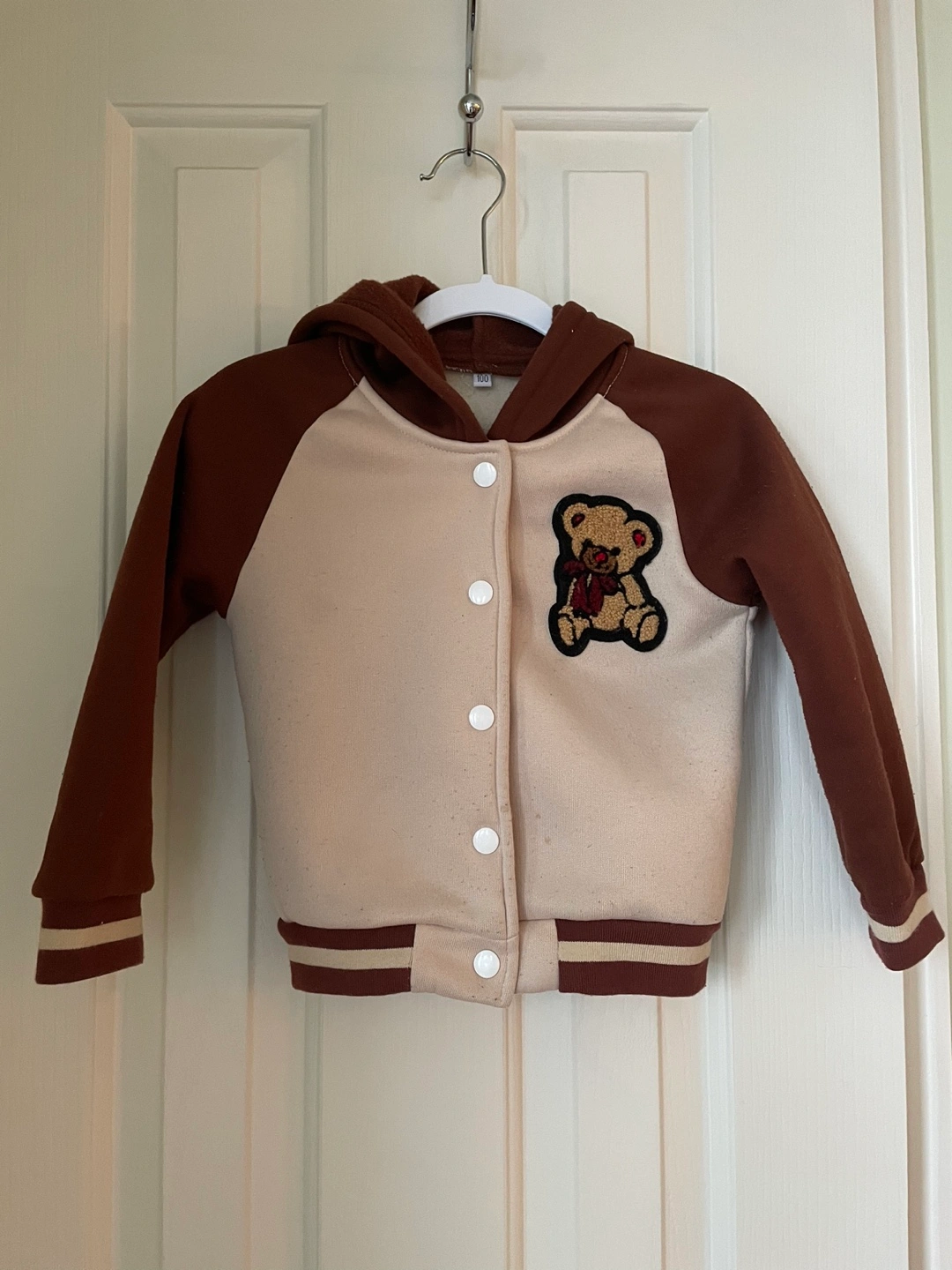 Toddler hooded varsity style jacket. Brown and cream colour featuring a cute embroidered teddy bear patch. Snap button closure. Fits toddlers 1-2