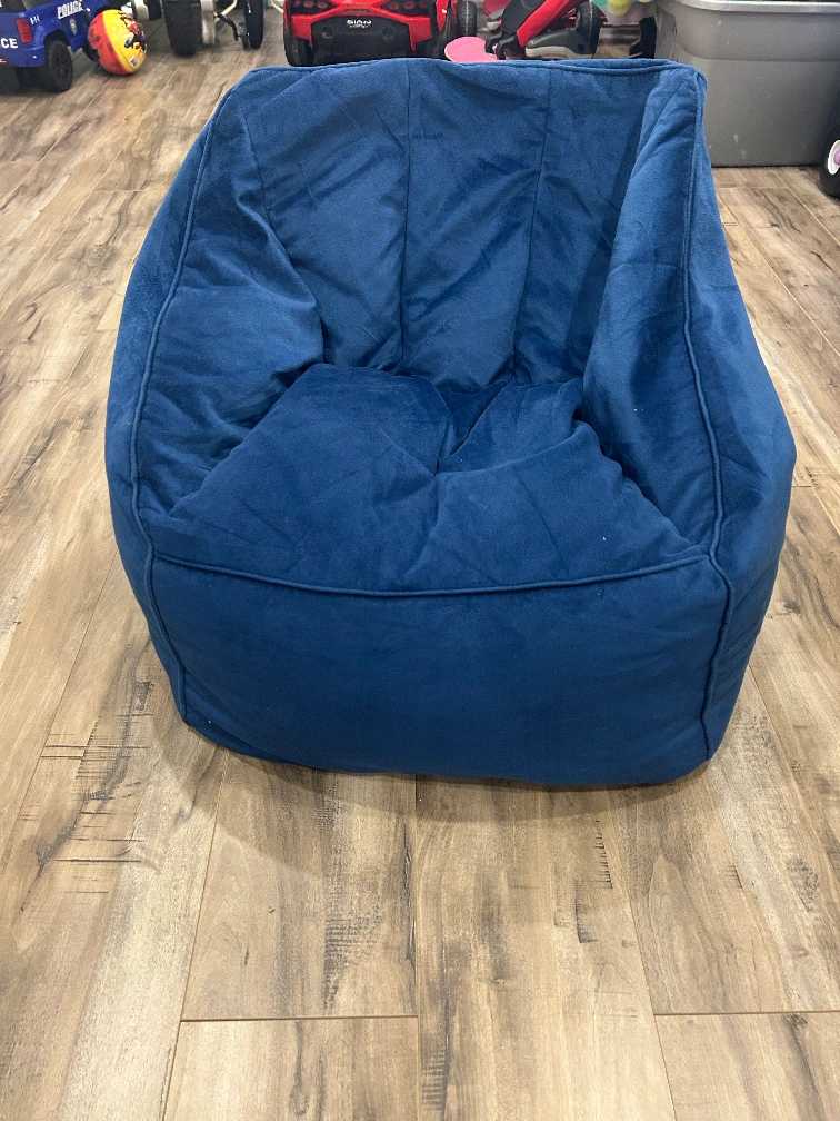 Plush blue bean bag chair. Perfect for kids' playroom or bedroom. Comfortable and durable fabric.