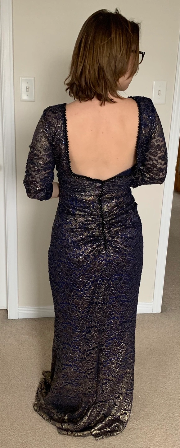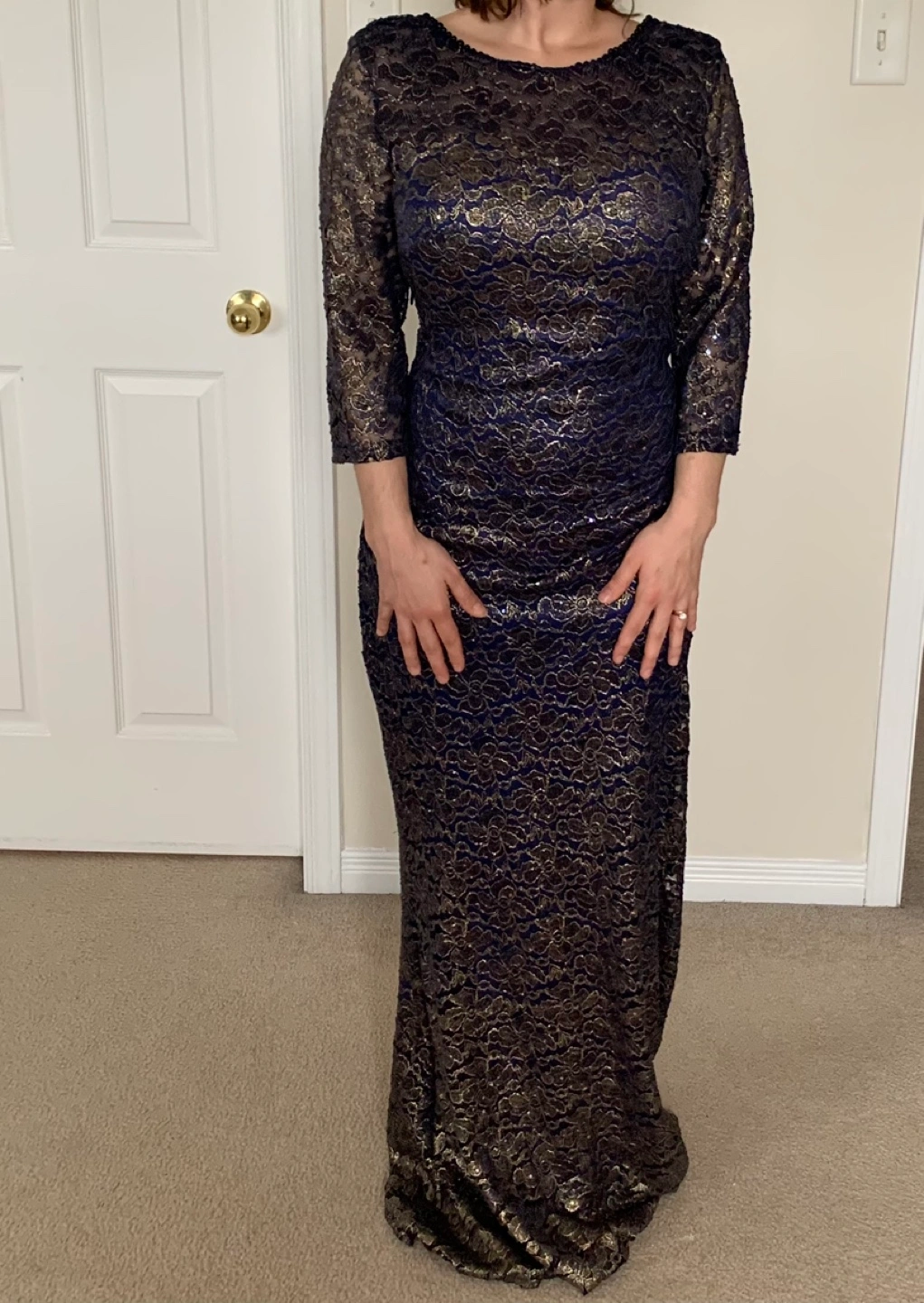 Elegant navy and gold long dress. Sequined lace fabric. Half sleeves. Fitted silhouette. Suitable for weddings or formal events. Never been worn. Just couldn’t return. Chose another dress for son’s wedding.