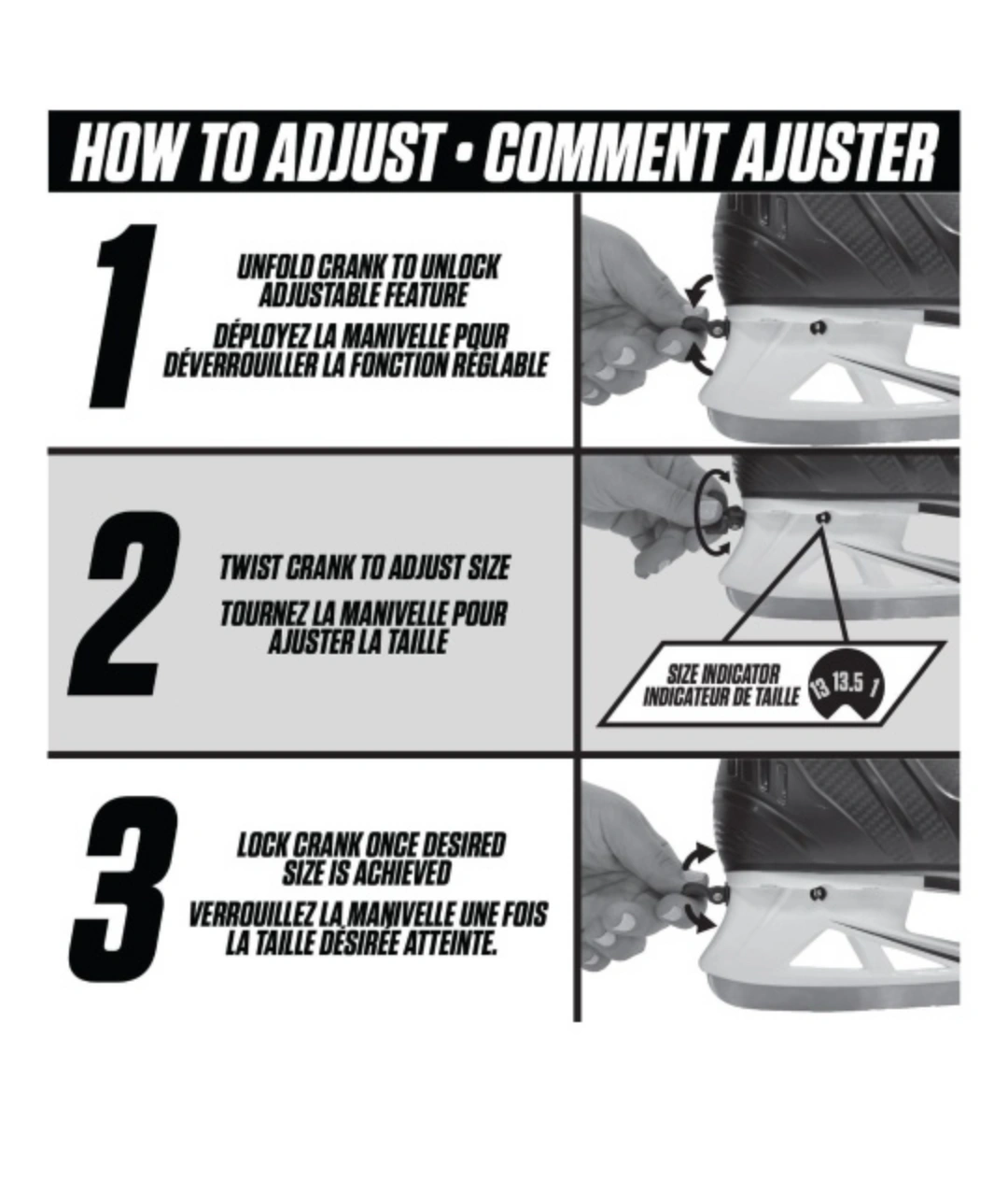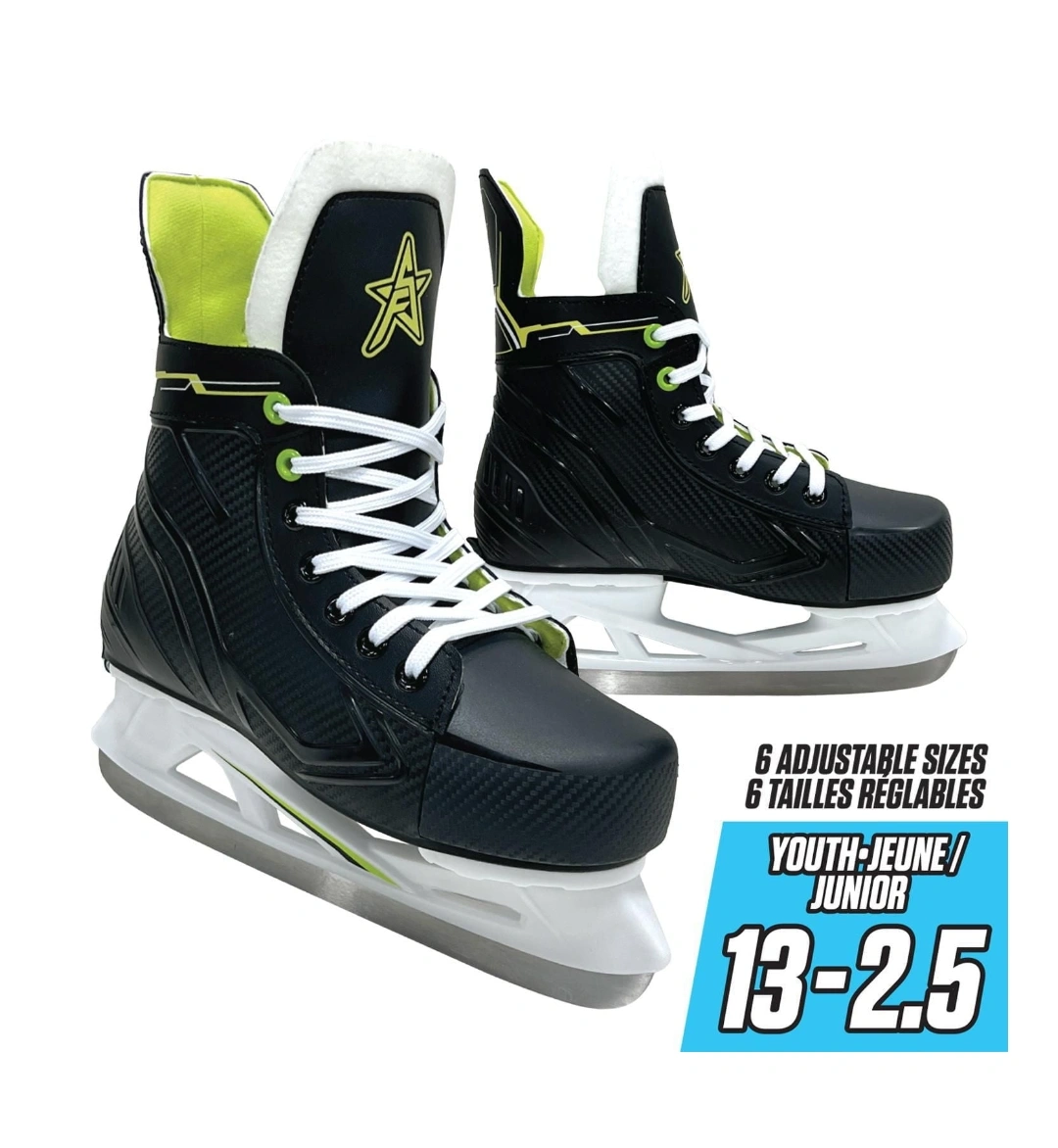 Youth adjustable hockey skates. Six adjustable sizes. Black with lime green accents. Durable construction. Great for young hockey players.