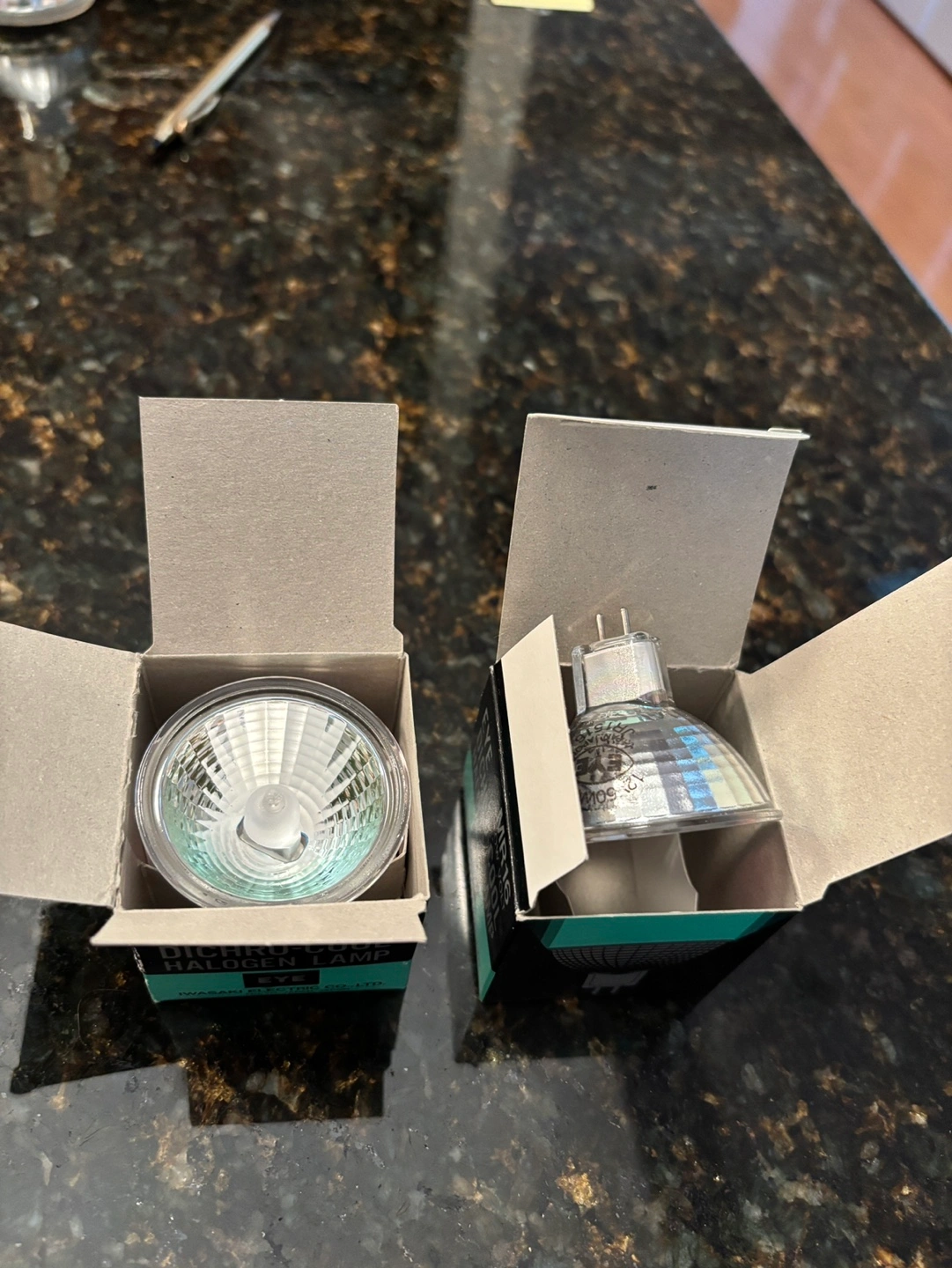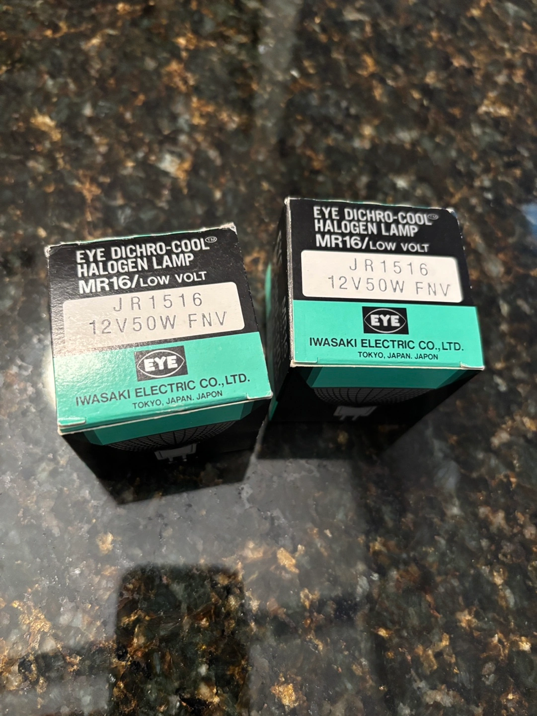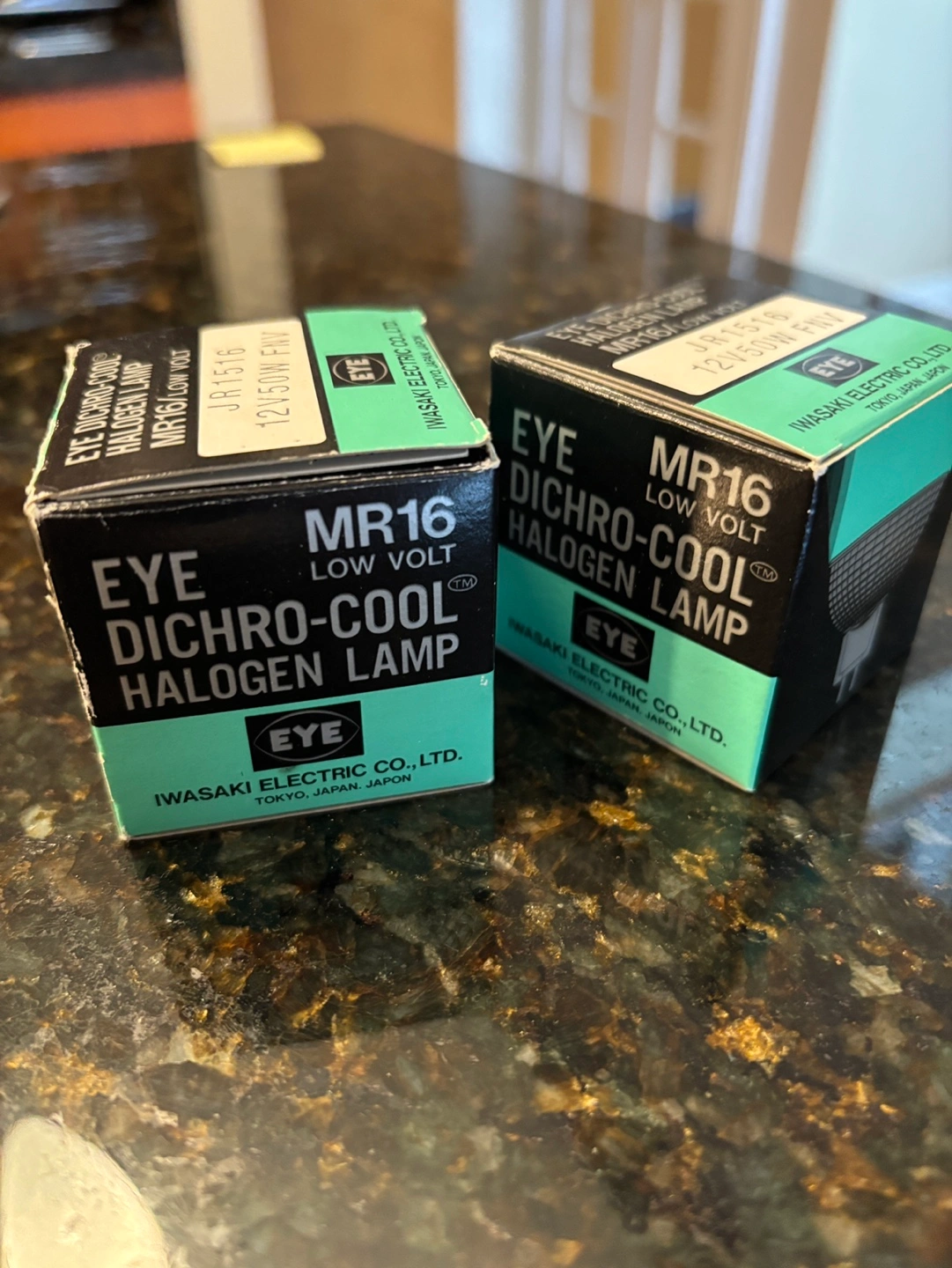 Pair of vintage Iwasaki Eye Dichro-Cool MR16 low voltage halogen lamps. 12V 50W. New, in original boxes. Perfect for retro lighting projects. From a pet and smoke free home. Pickup only in the St Lawrence market area of downtown Toronto. Cash only.