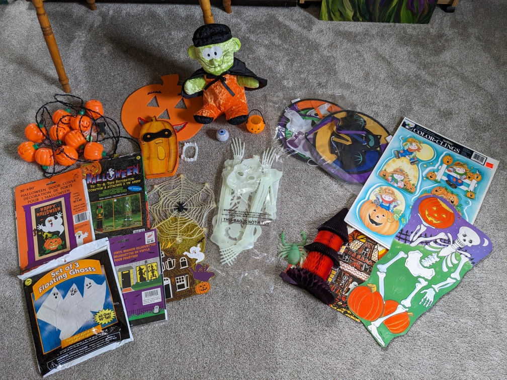 Large lot of Halloween decorations. Includes lights, hanging decorations, window clings, and more. Perfect for parties or home décor. $50 for whole package or will sell separately as well