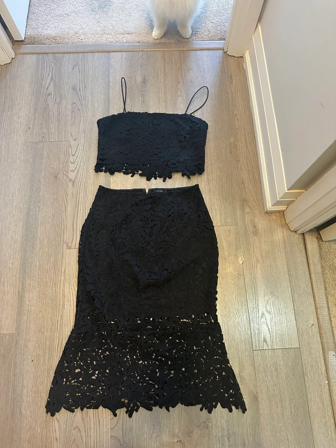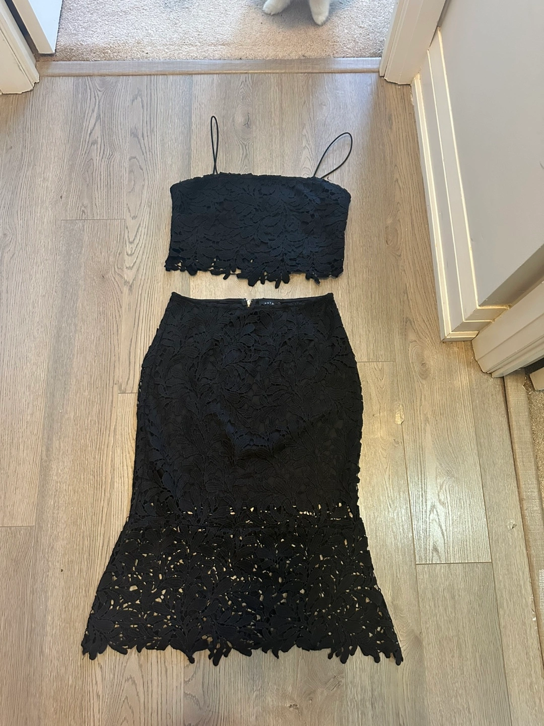 Stunning black lace two-piece outfit. Features a fitted crop top and a midi skirt with a flattering flare. Perfect for a special occasion.