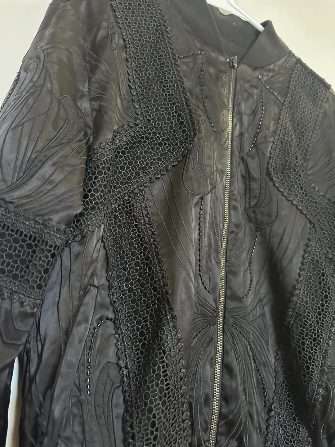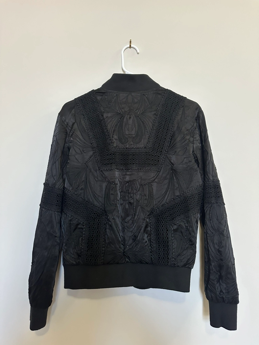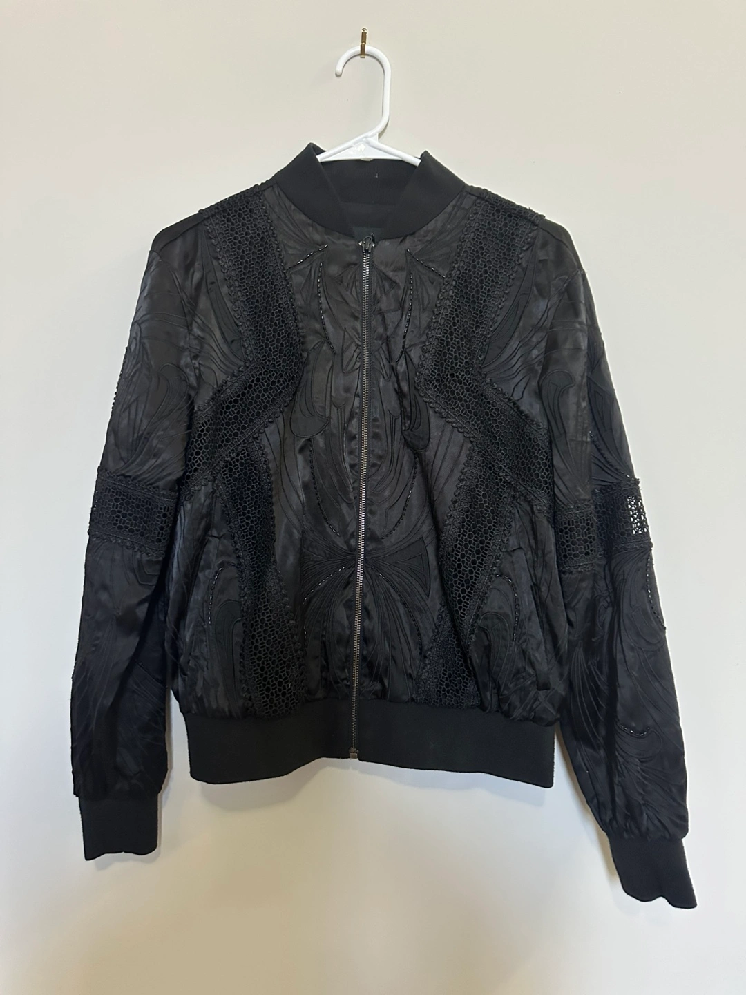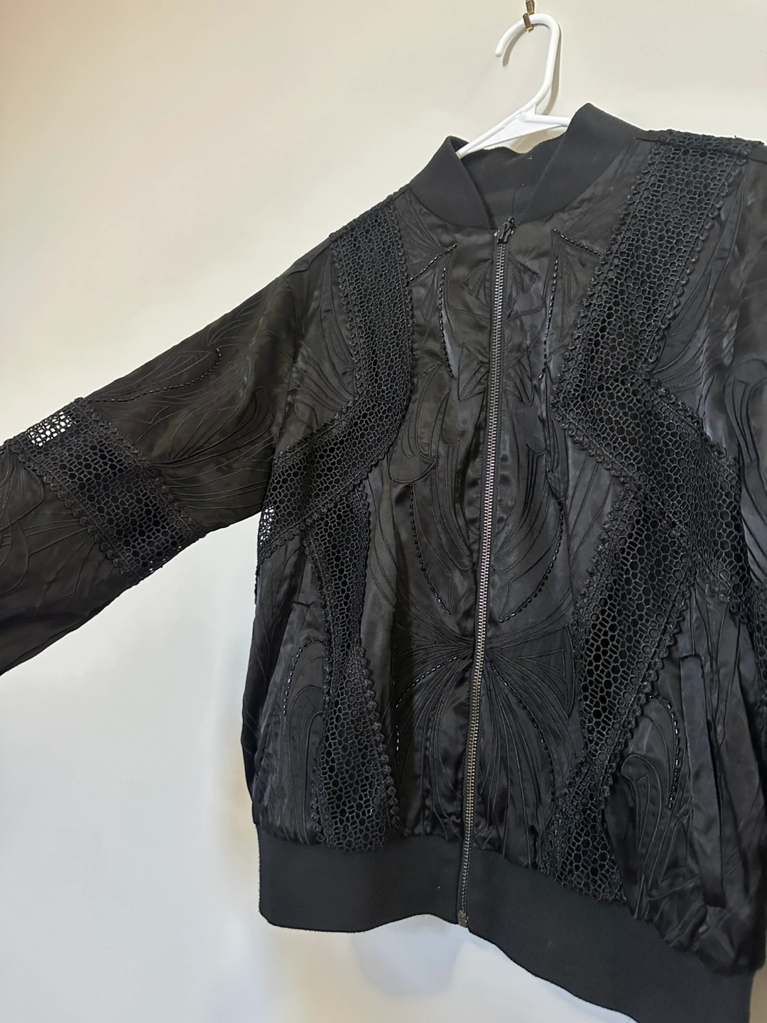 Marciano Stylish black bomber jacket. Features intricate embroidery and lace detailing. Long sleeves, zip front closure. Great for adding a touch of elegance to your outfit.