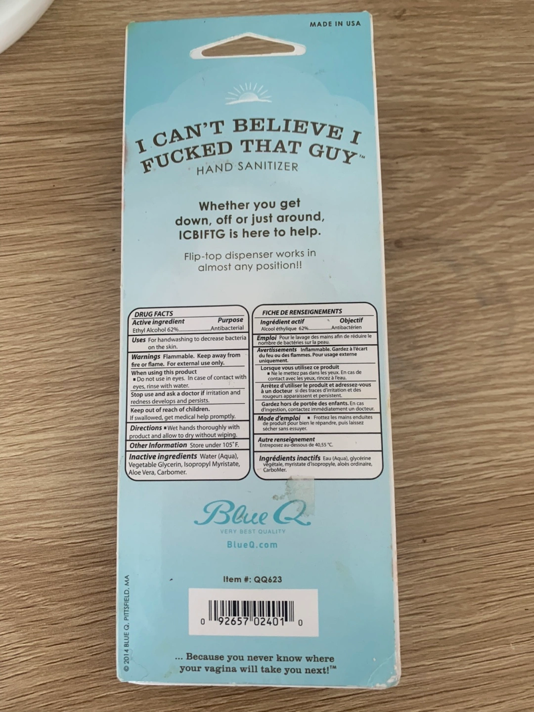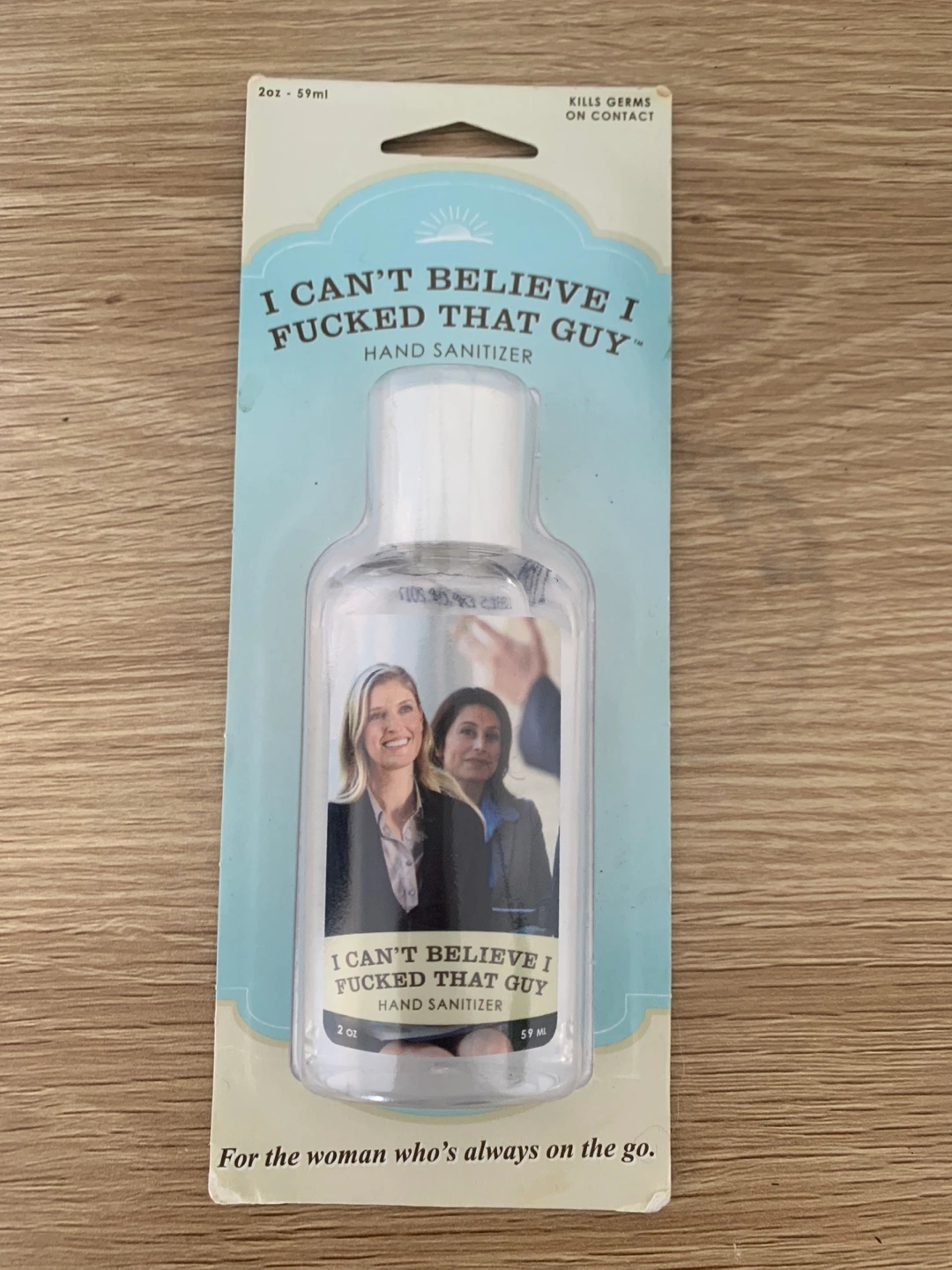 2 oz hand sanitizer. Humorous packaging. Kills germs on contact. Flip-top dispenser. For women on the go. New in package. Perfect for gifting. Pick up in Riversdale. Cash only please.
