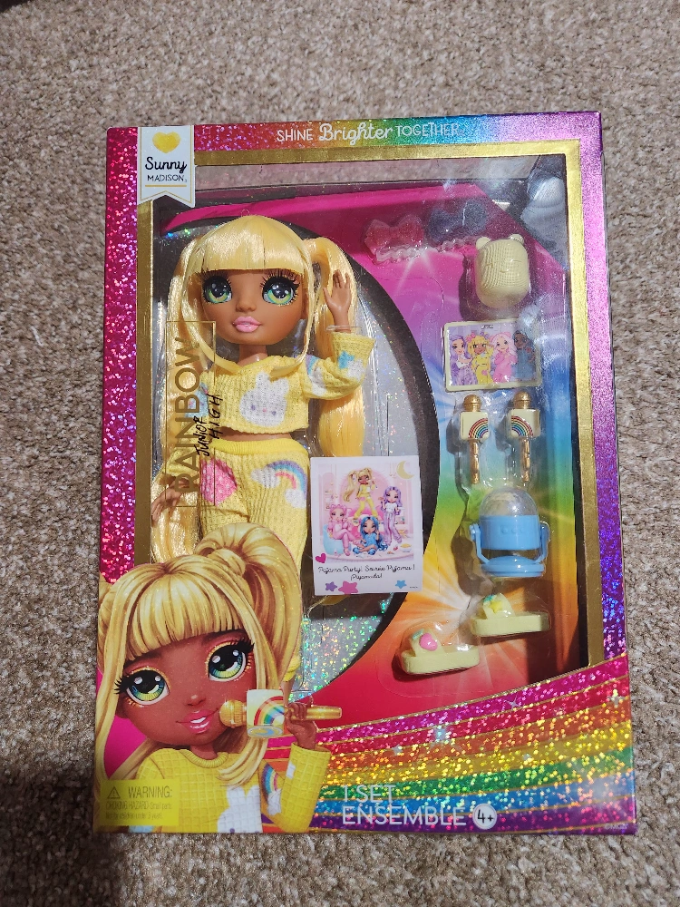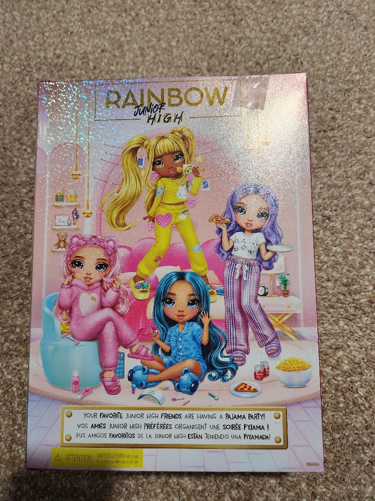 Brand new Rainbow High Junior High Sunny Madison pajama party playset. Includes moveable doll, outfit, and accessories. Great for collectors or kids.