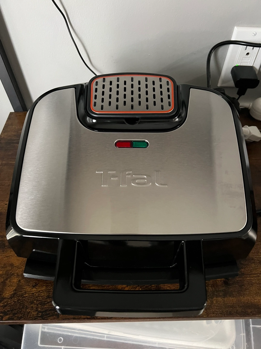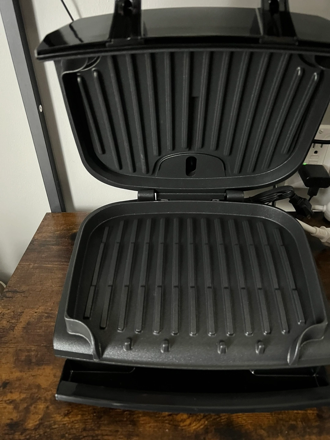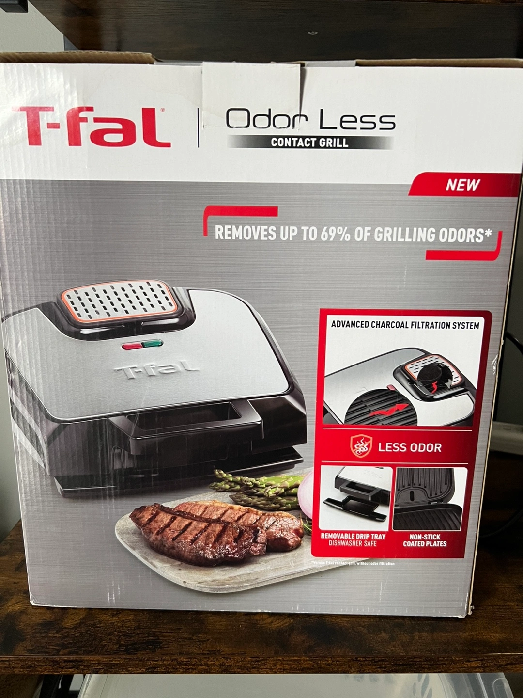 New T-fal Odor-Less Contact Grill. Features advanced charcoal filtration system. Removes up to 69% of grilling odours. Non-stick coated plates. Removable drip tray, dishwasher safe. Great for indoor grilling.