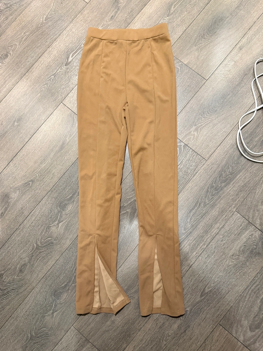 High-waisted pants, camel colour. Side splits at the hem. Stretchy material. Excellent condition washed once never worn. Buy three items from my listings and get one under 10 for free! Multiple purchases come with decent discounts!