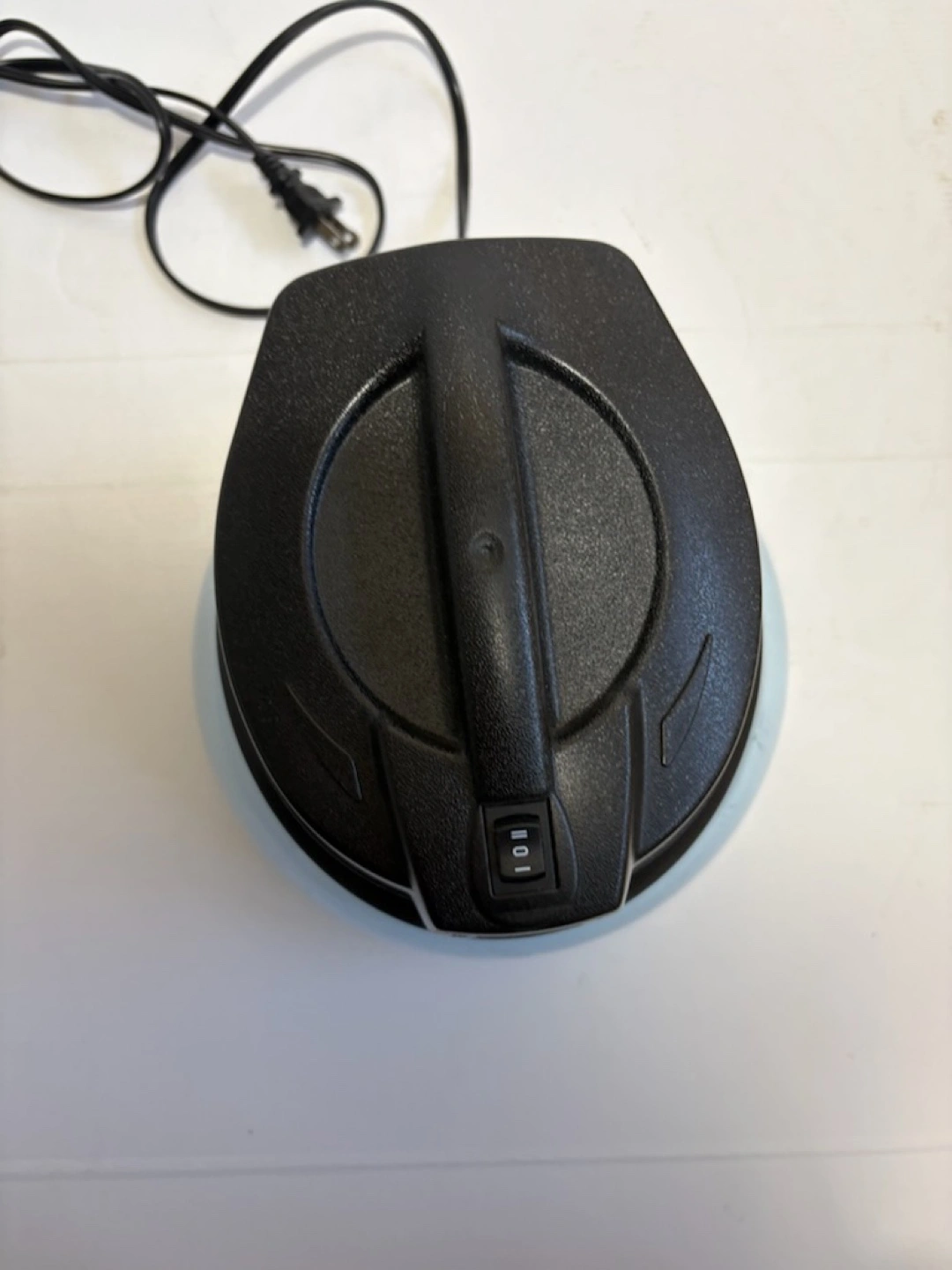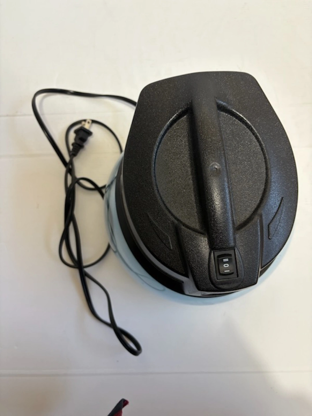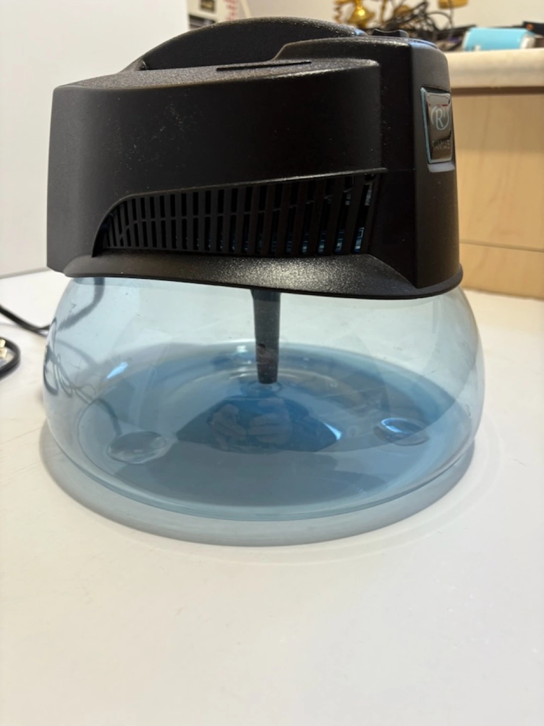 Cool mist humidifier with mist. Add some drops of fragrant oil. Black and clear plastic. Power cord included.