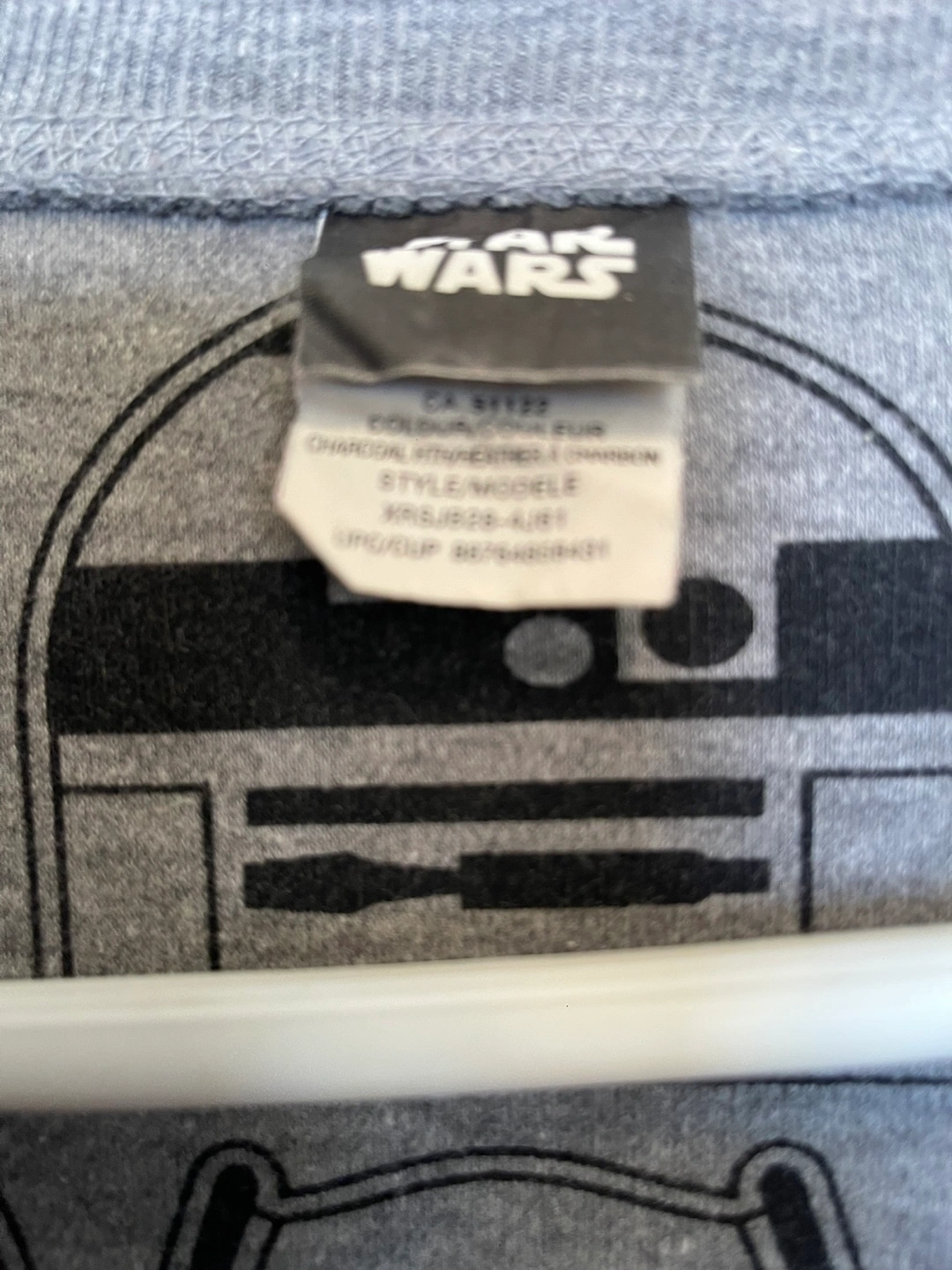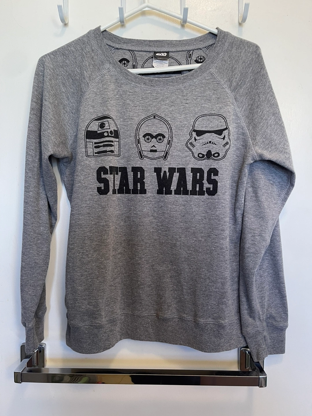 Grey Star Wars long sleeve pullover shirt. Features R2-D2, C-3PO, and Stormtrooper graphics. Long sleeves, crew neck. Officially licensed product. Very good condition. 60/40 cotton/polyester. Machine wash and dry. Size medium fits 7–9.