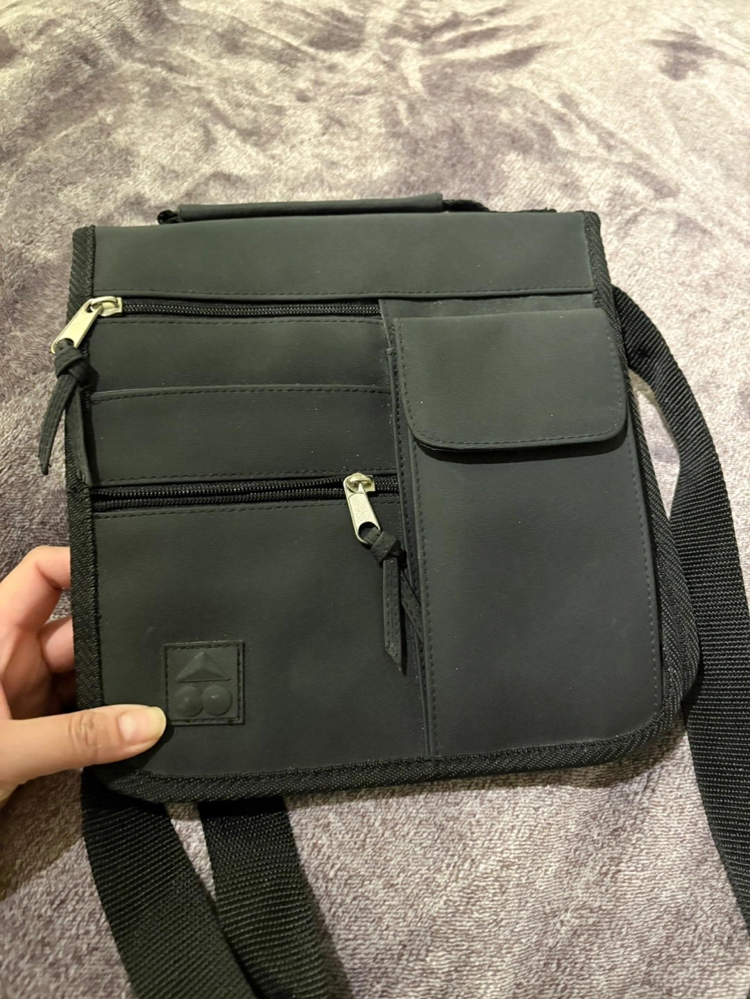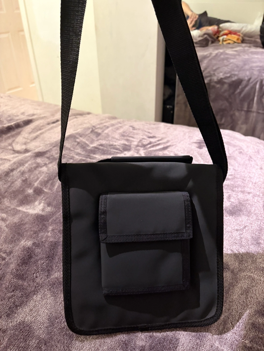 Small black crossbody bag. Features multiple zippered pockets and a clear plastic window. Adjustable shoulder strap. Ideal for carrying small essentials. Brand new