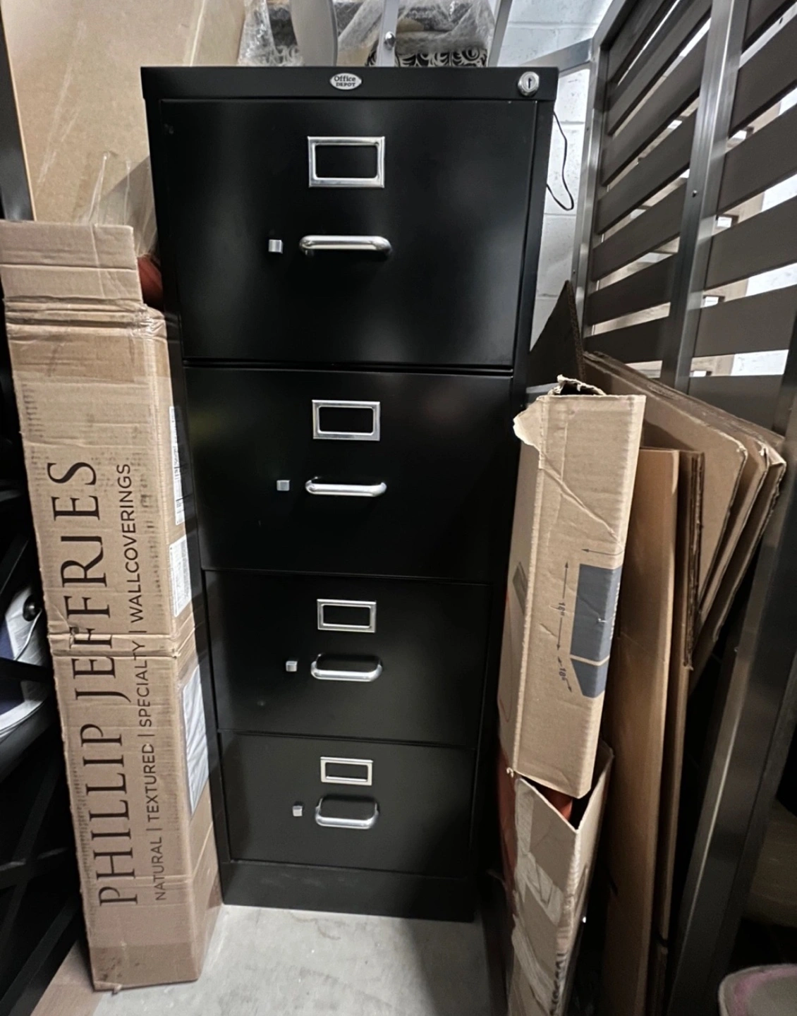 Large black metal filing cabinet about 5 feet tall, 2 feet wide and 3 feet deep. Everything works fine, very minimal wear and tear (if any). Used originally as home office filing cabinet - Great for organization in storage locker or a garage Key for lock is lost