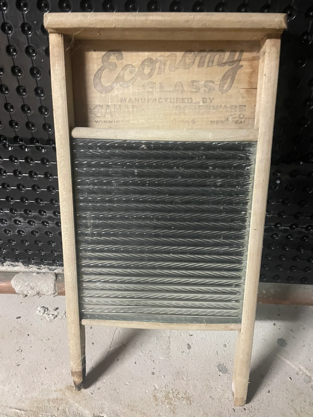 Antique washboard. Wooden frame. Glass surface. Manufactured by Canada Glassware Co. Winnipeg and Montreal.