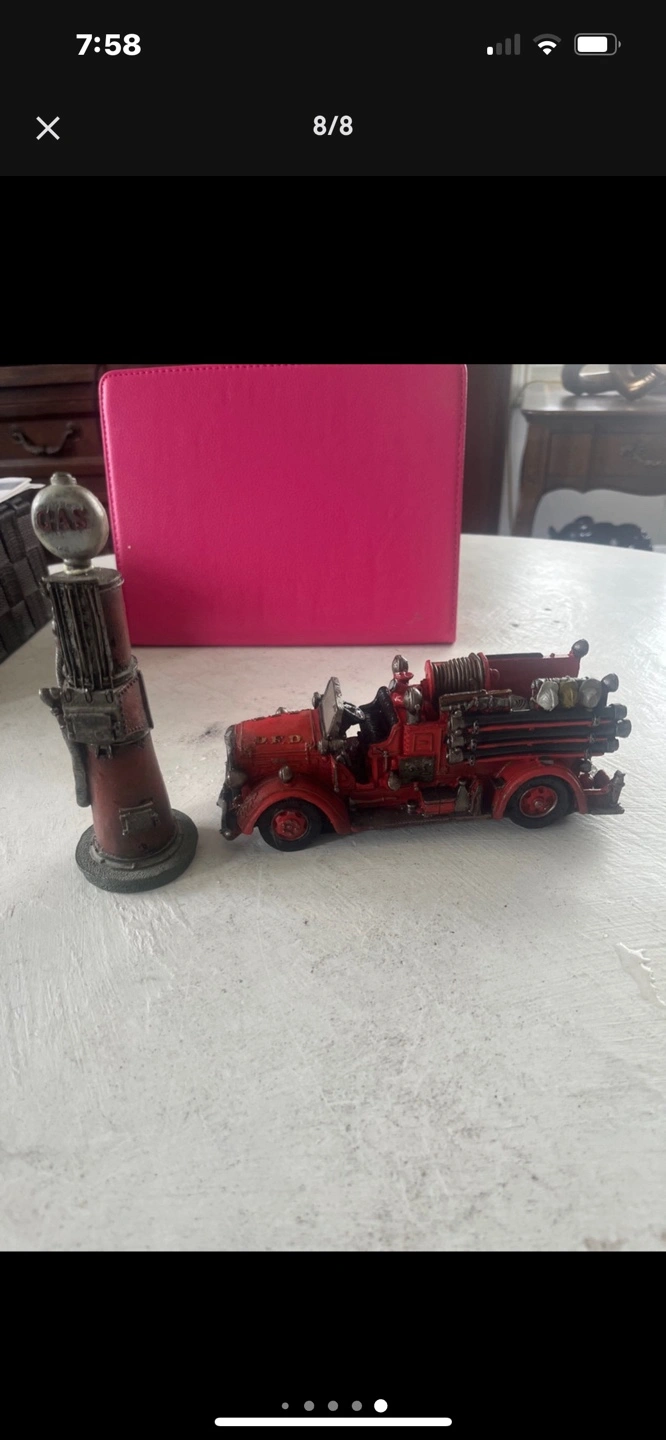 Detailed miniature firetruck and gas pump. Red and metallic accents. Collectible item. Great for display.
