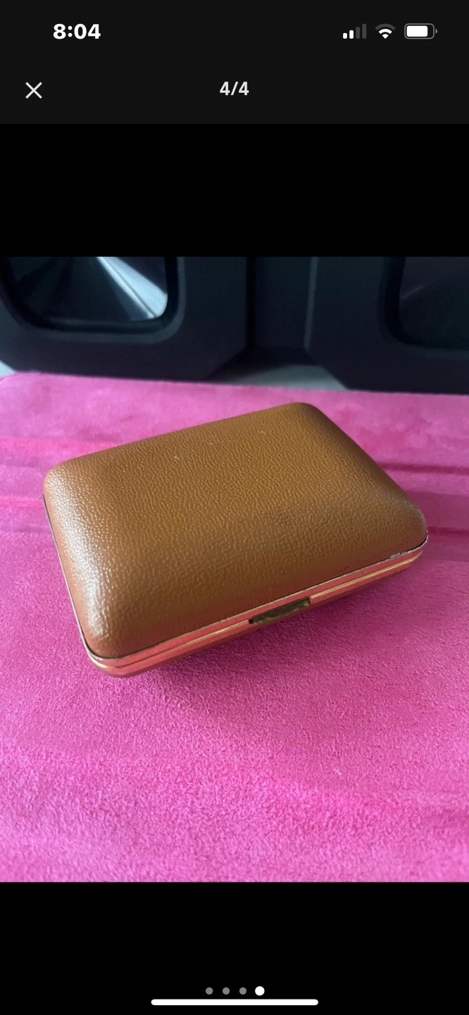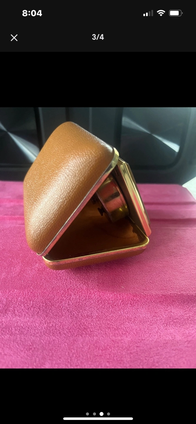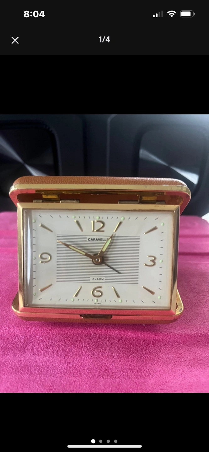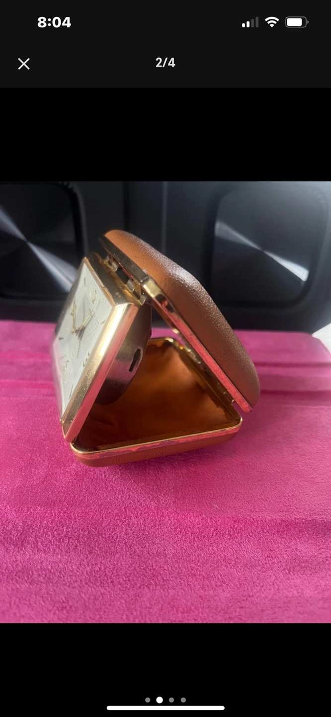 Square-shaped alarm clock. Gold-toned accents. Brown leather carrying case. Vintage .