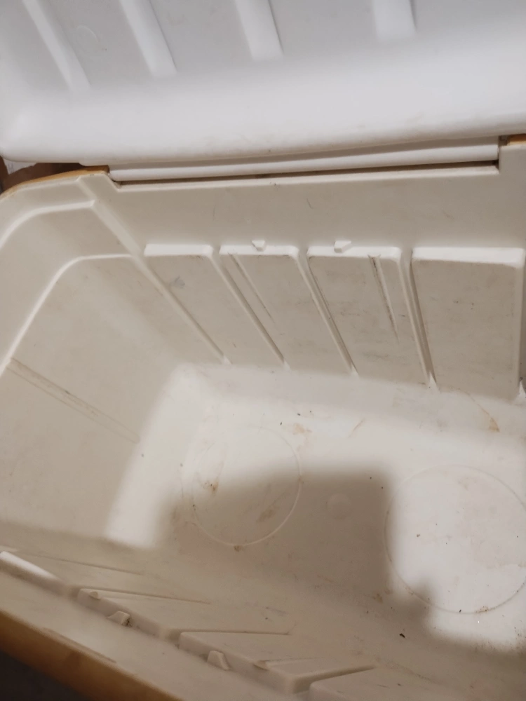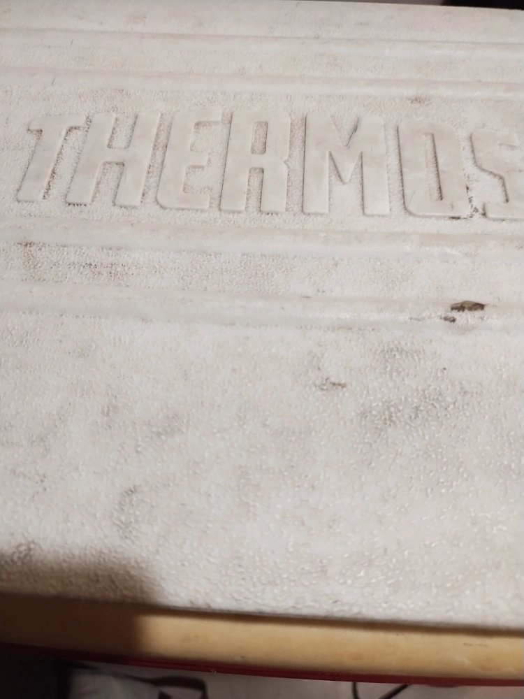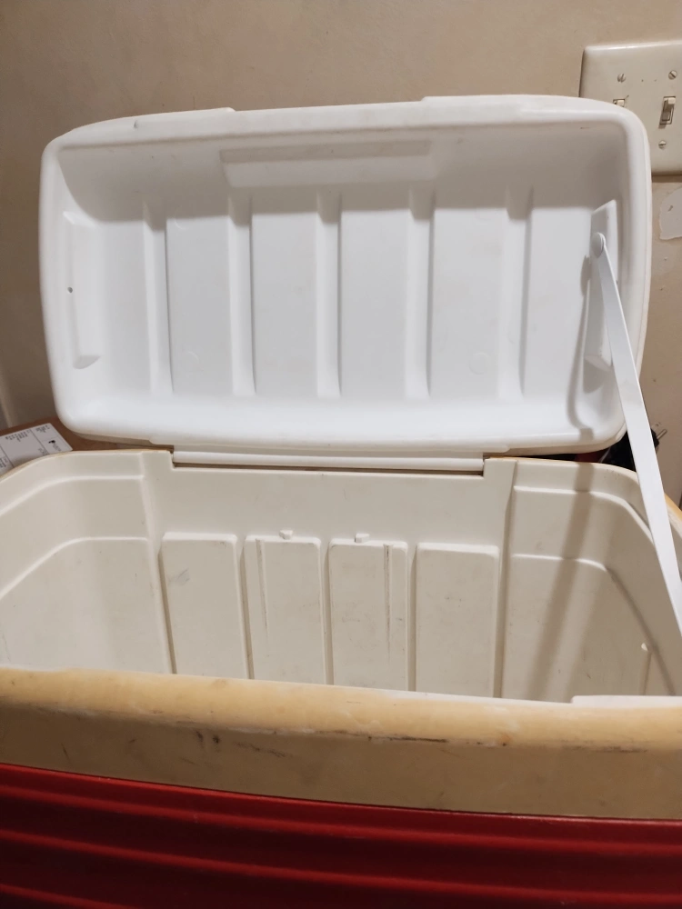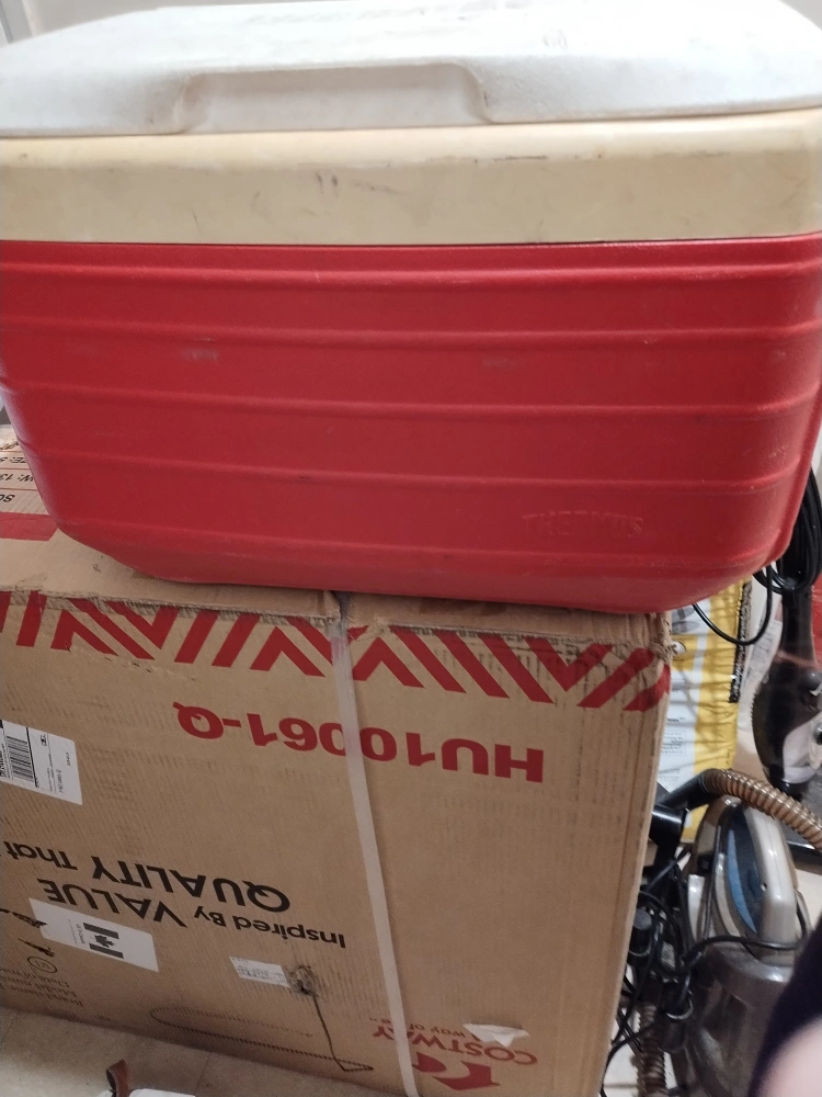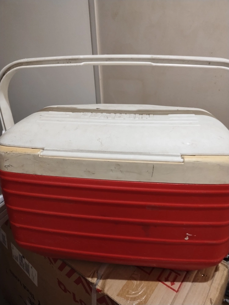 Red and white plastic cooler. Features a carrying handle. Shows some wear from age. needs a clean, I've done my best.