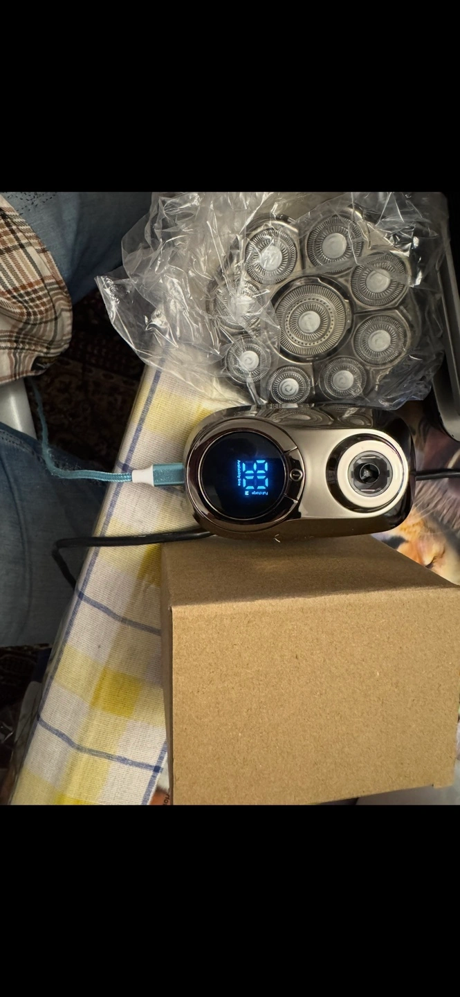 Cordless electric shaver. Includes multiple replacement heads. Digital display shows battery life. Comes in original packaging.