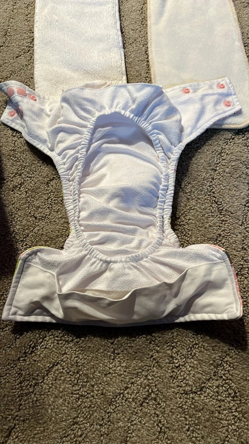 One size cloth diaper. Pretty floral print. Includes insert. Snaps and elastics. Excellent condition
