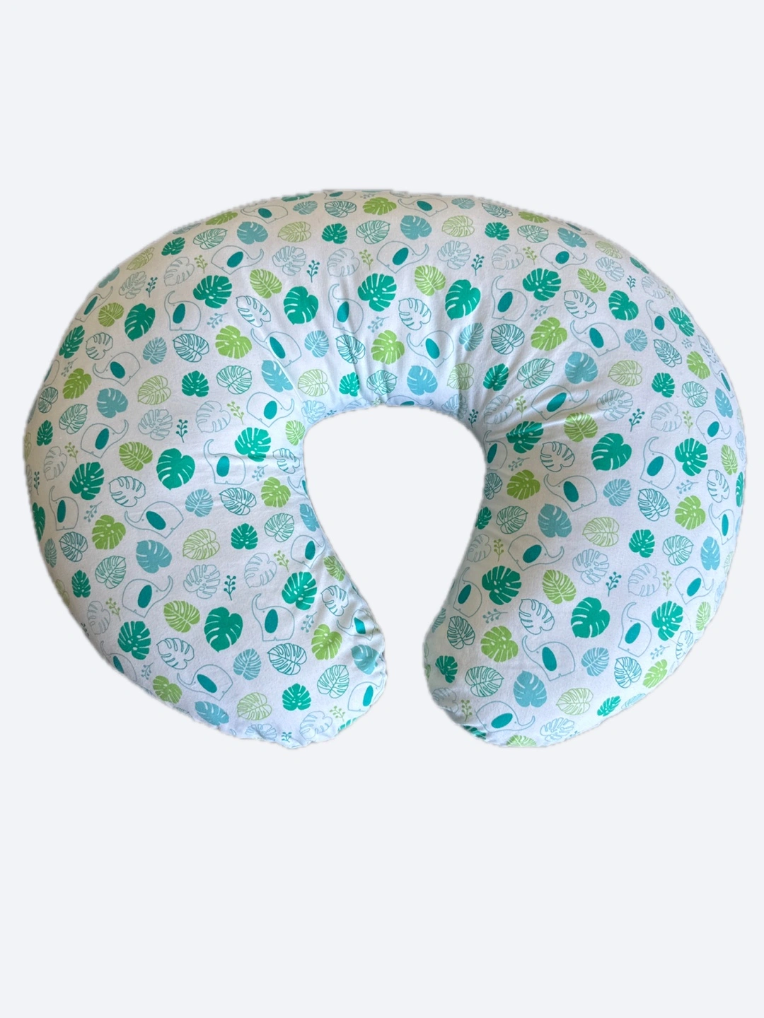 Nursing pillow. Soft and supportive. Features a light-coloured cover with a teal tropical leaf pattern. Ideal for pregnancy and breastfeeding. Retails for 40