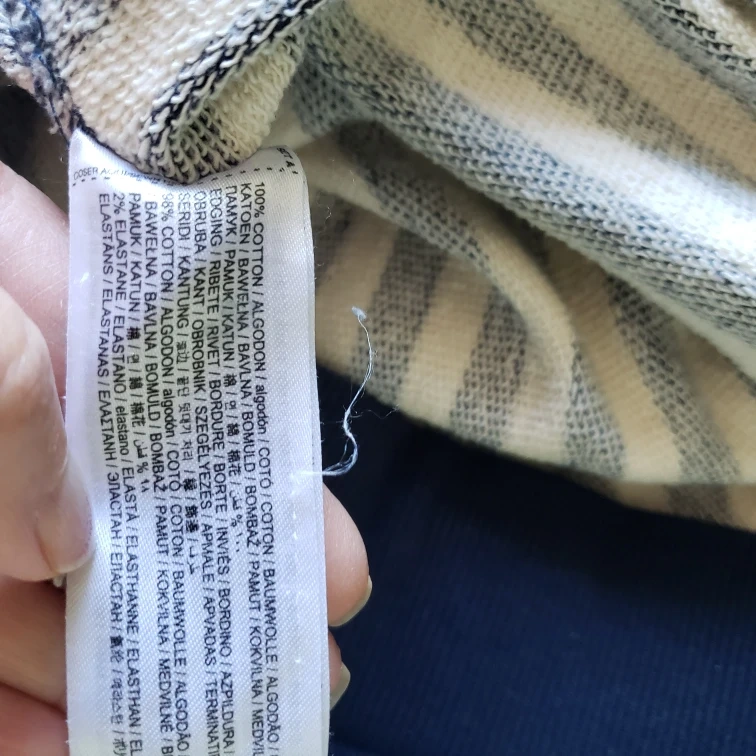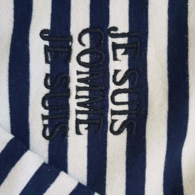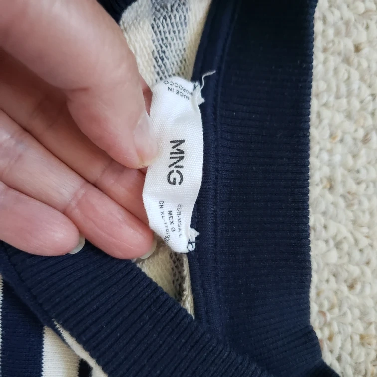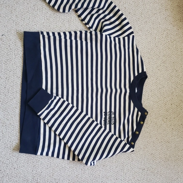 Trendy striped long-sleeved sweater. Embroidered detail. Navy and white colours. 100% cotton. Exellent condition. From no smoke/pets home