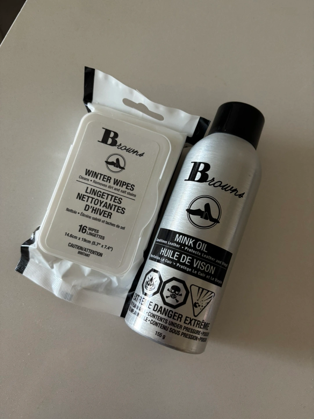 Brown's leather care kit. Includes a can of mink oil and a pack of winter wipes. Cleans, removes dirt and stains. Protects leather. Perfect for cleaning boots ! Originally priced at $18 and $10