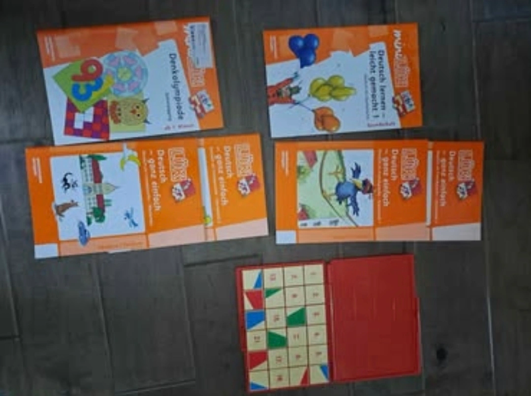 Set of children's German language learning books and a matching control unit. Includes workbooks and activity books. Perfect for learning German.