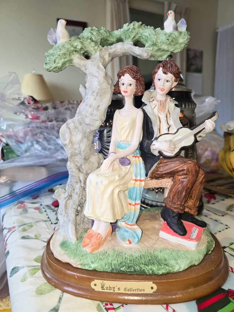 I will be moving soon! if you want this get it now! Charming figurine, a couple sitting under a tree. Features detailed clothing and a book. Wooden base. Part of Ruby's Collection. collectible.