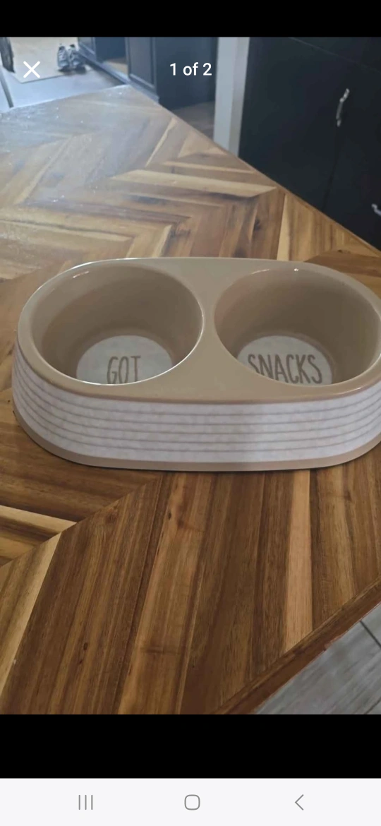 Double pet bowl. Beige ceramic. Words "Got" and "Snacks" on each side. Raised textured band around the base.
