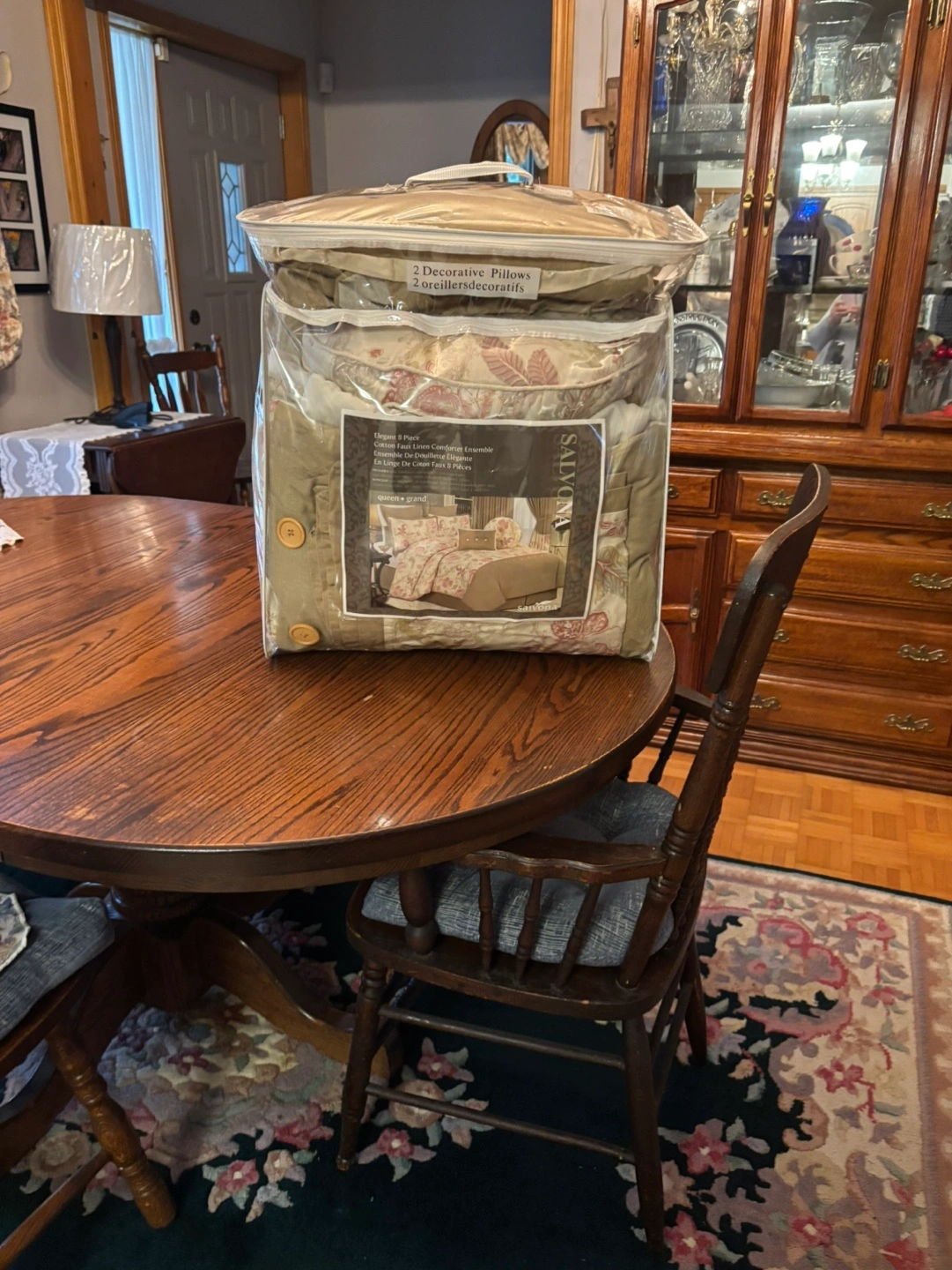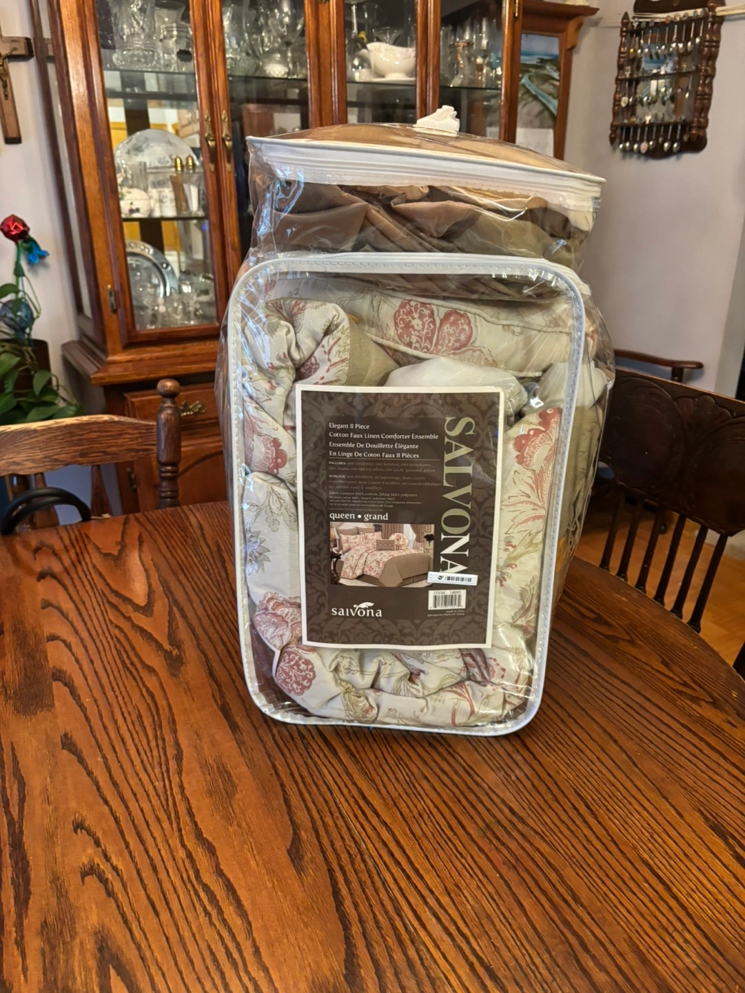 New 8-piece queen comforter set. Floral pattern. Includes comforter, shams, and decorative pillows. Packaged in plastic.