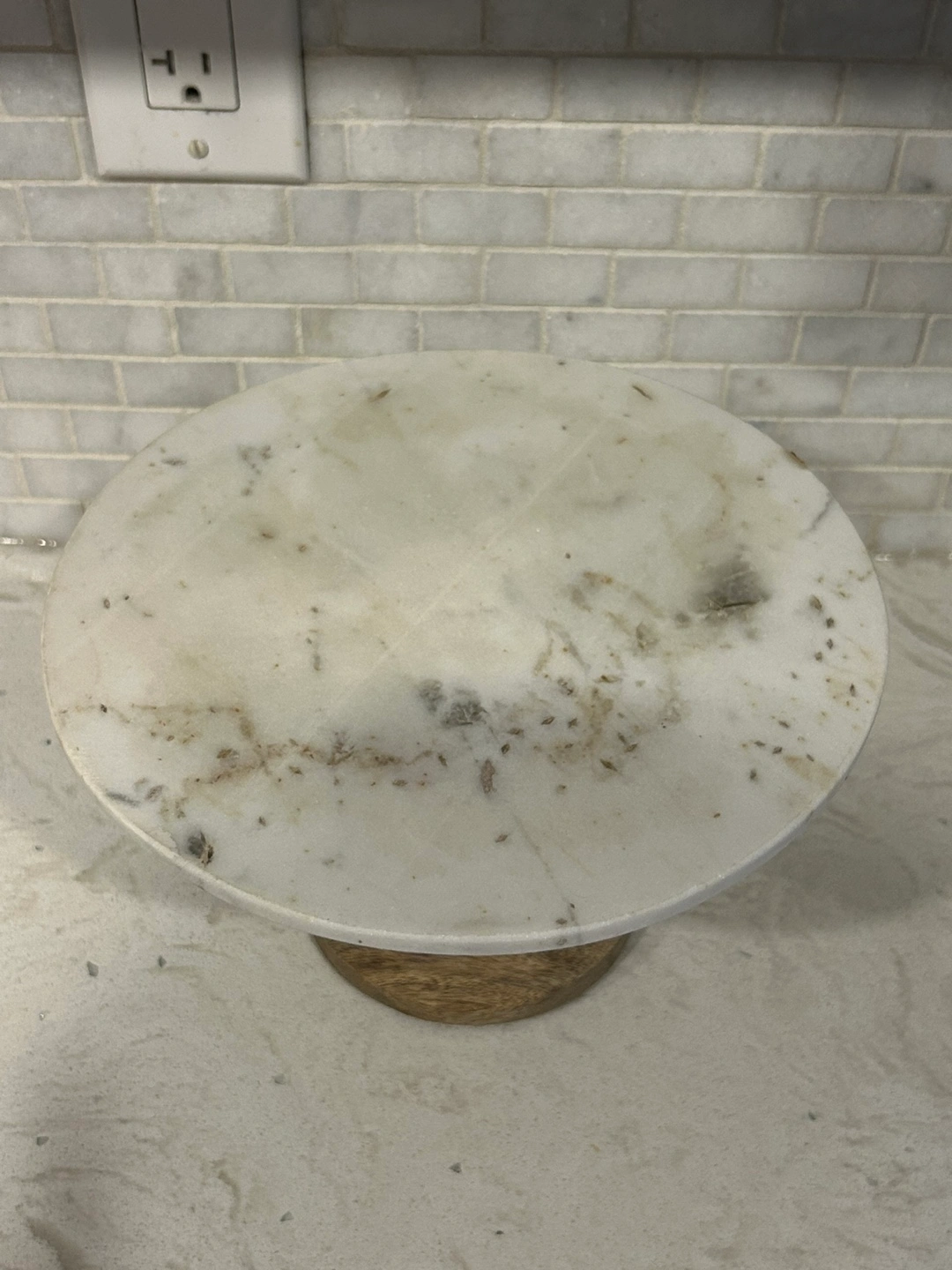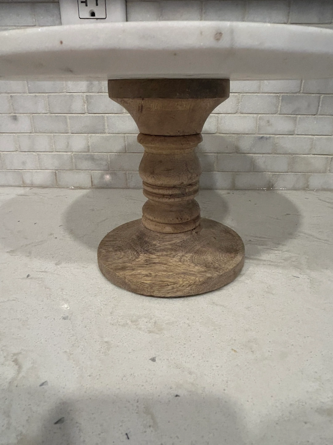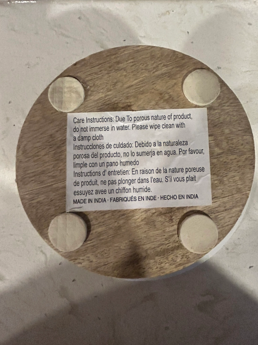 Round marble top. Wooden pedestal base. Made in India. Care instructions included. Wipe clean with a damp cloth. Do not immerse in water.