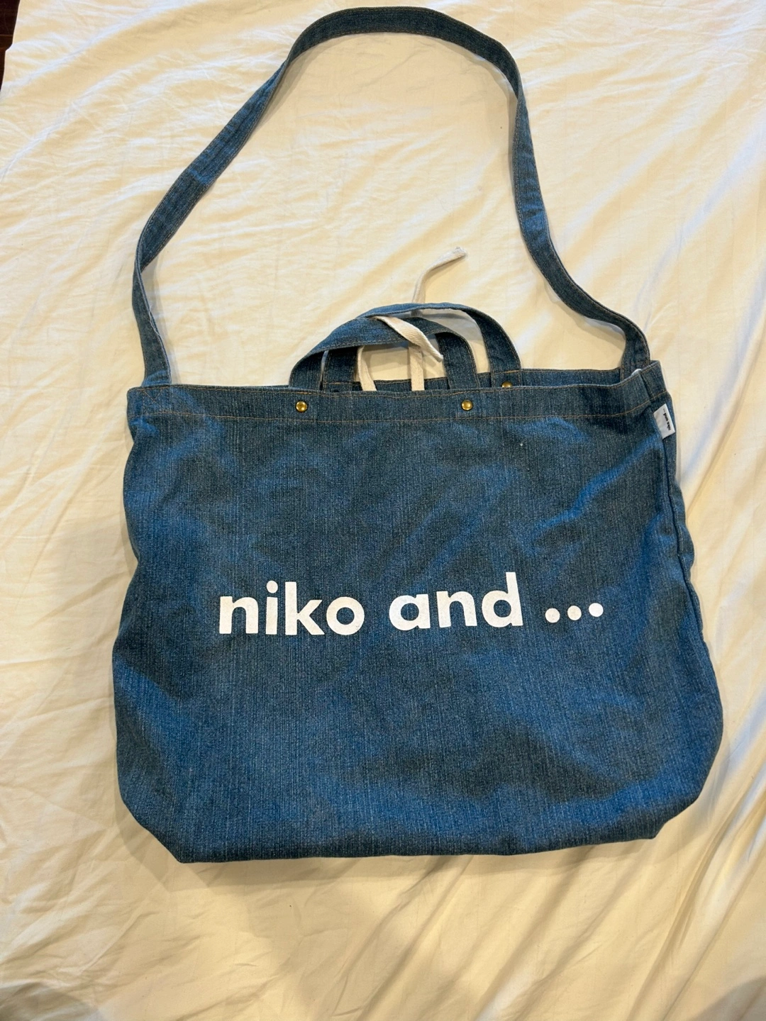Blue denim tote bag from popular Japanese brands: Niko and… It can easily fit a laptop, iPad, and plenty of other essentials! Perfect for work or school Feel free to message me if you have any questions!