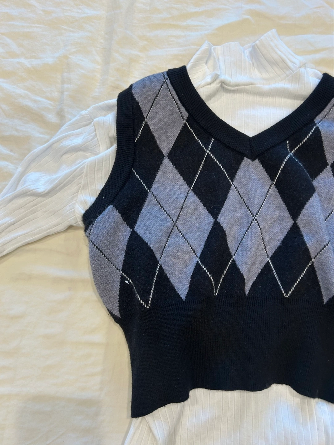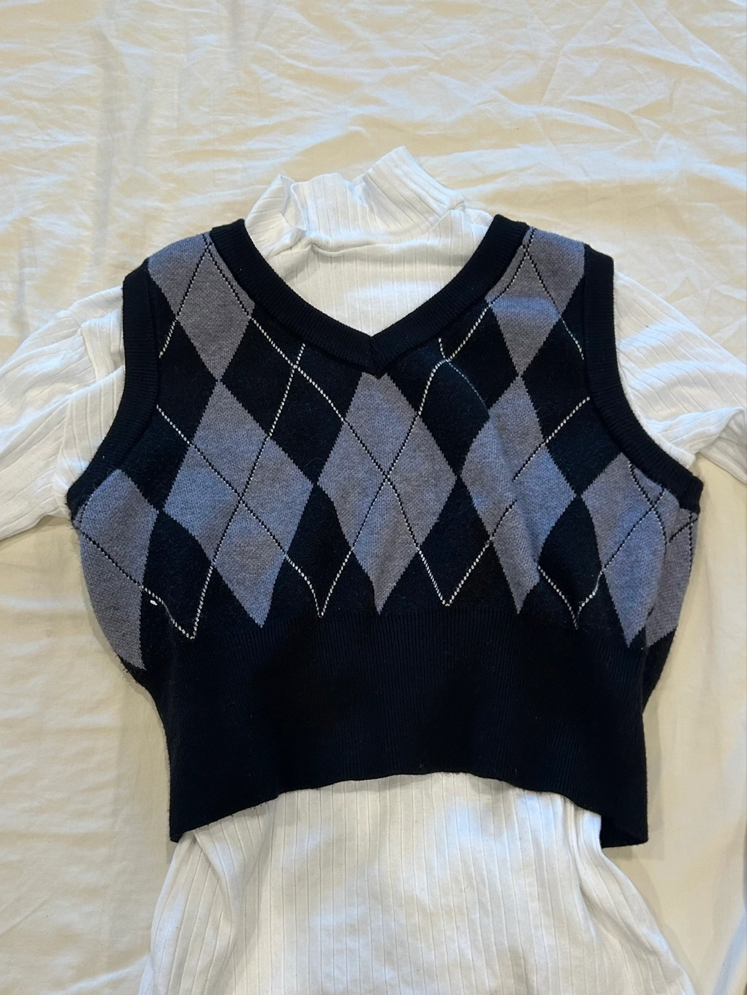 Women’s cropped argyle sweater vest, comes with a separate white t-shirt!! Made from knit material. Feel free to message me if you have any questions!