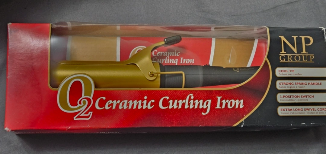 Gold ceramic curling iron. Features cool tip, strong spring handle, 3-position switch, extra long swivel cord. 38mm Barrel size