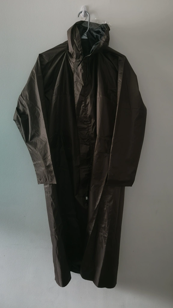 Long dark brown raincoat. Features a hood and long sleeves. Water resistant outer shell. Perfect for rainy days.