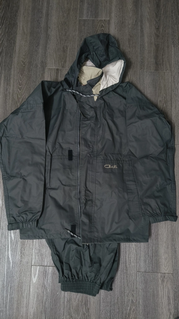 Men's dark green rain suit. Brand new / Not used / Jacket features a hood and zipper closure. Elastic cuffs and waistband on pants. Great for rainy days.