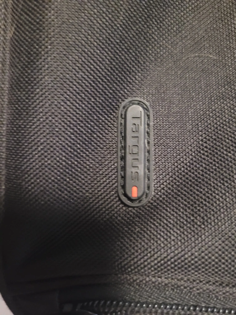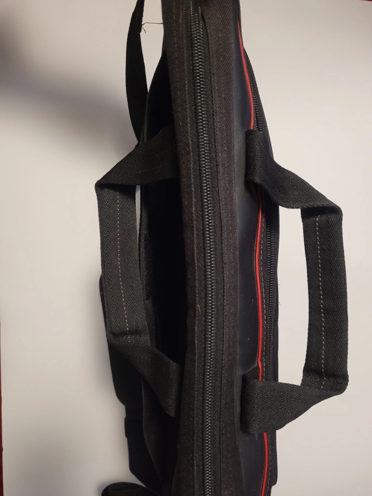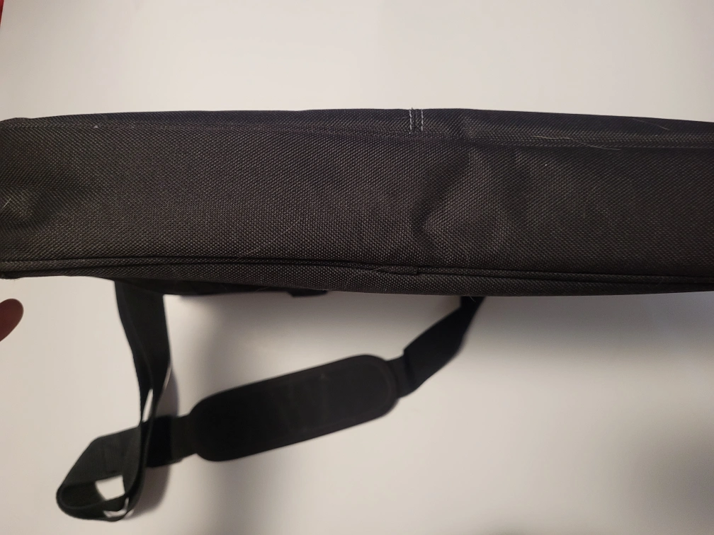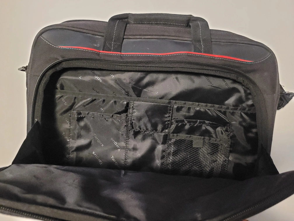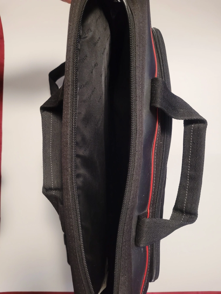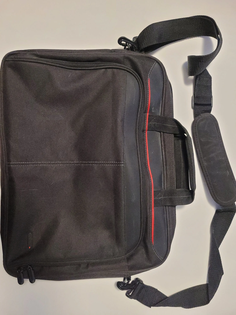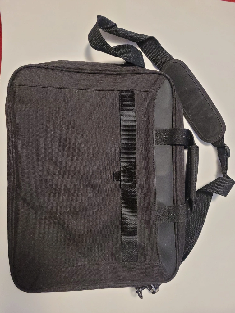 Black laptop bag. Features a shoulder strap and top handles. Multiple interior compartments and pockets. Zipper closure. Great for work or school.