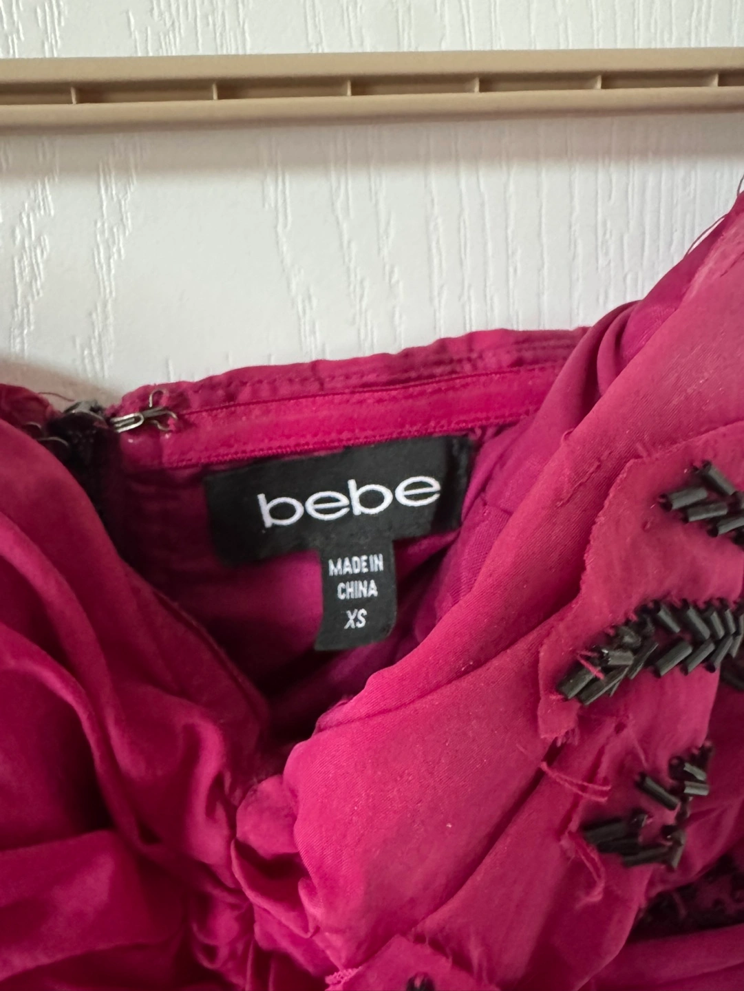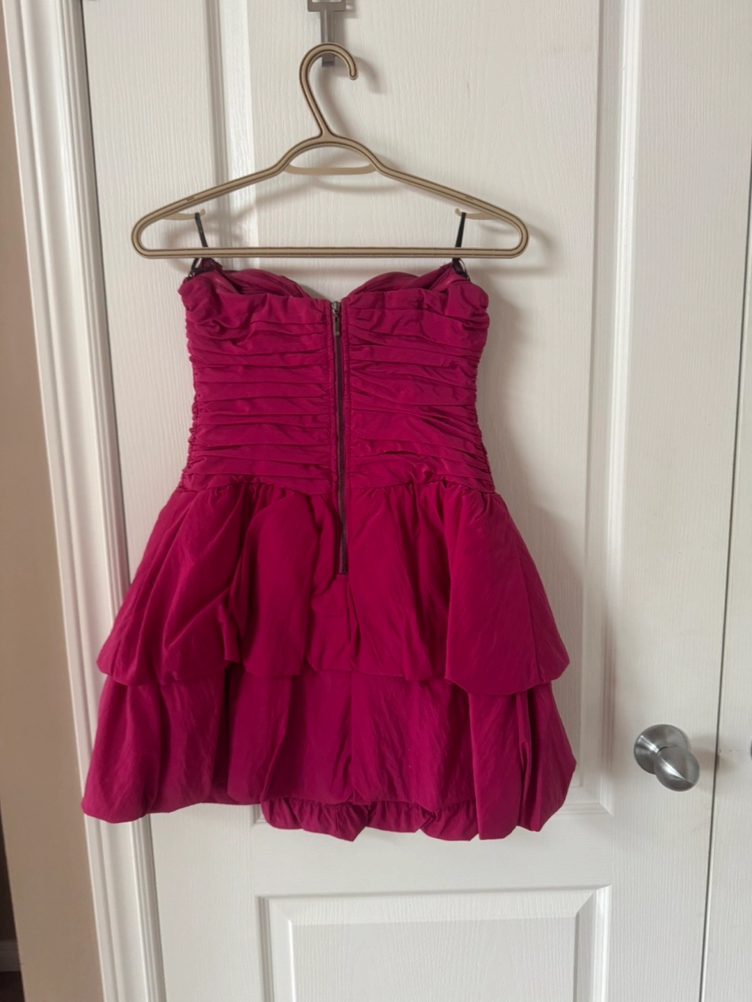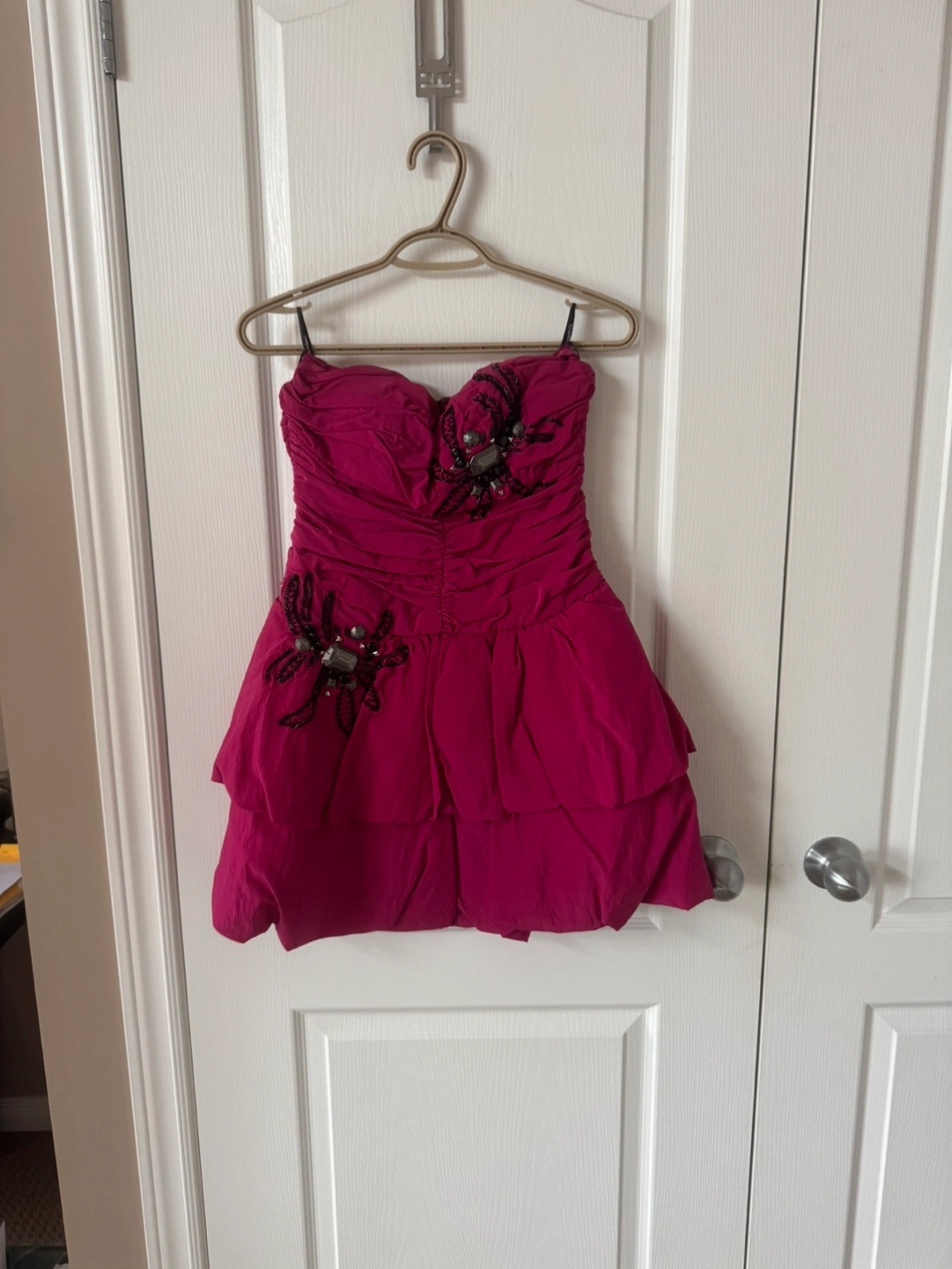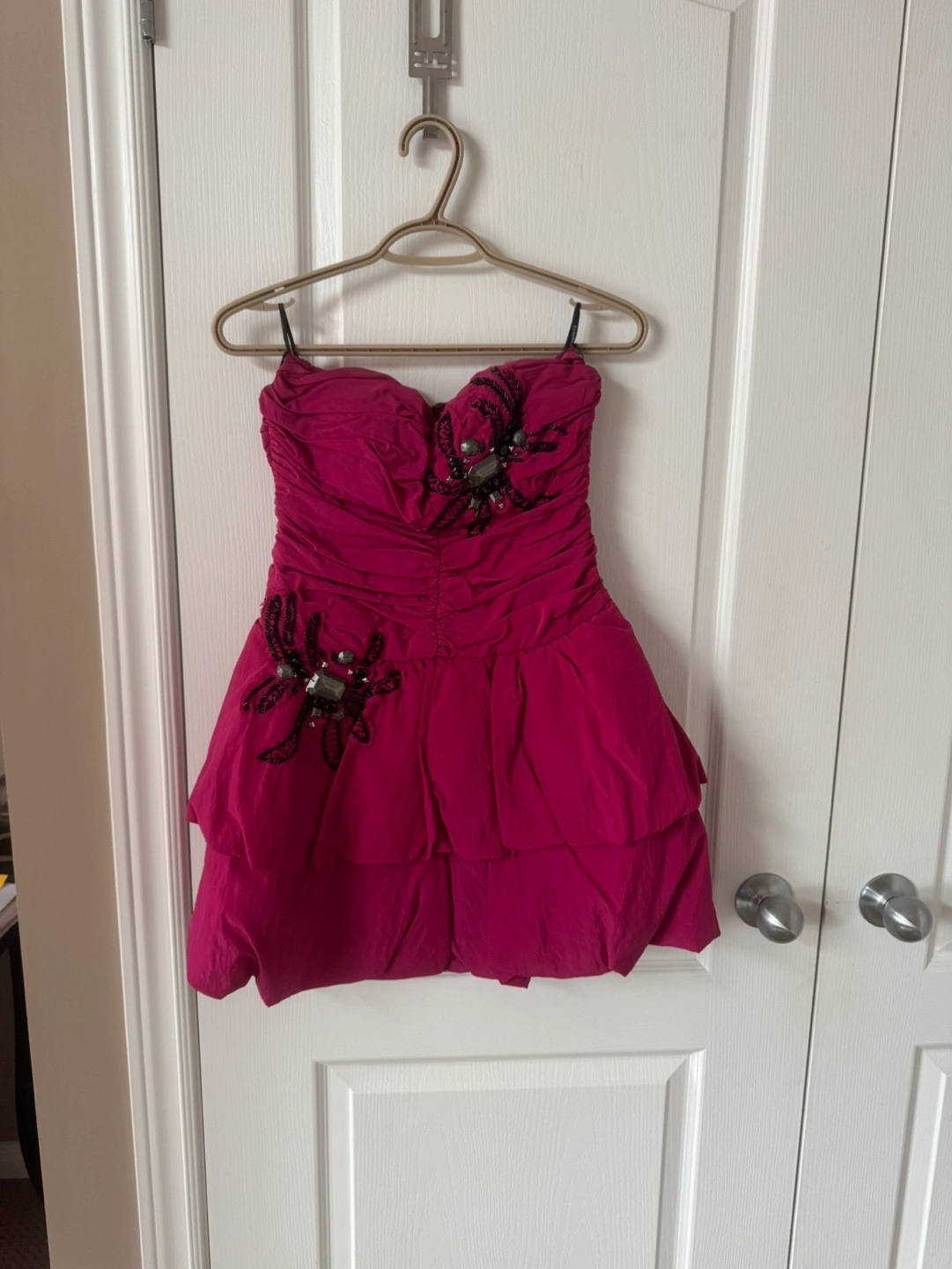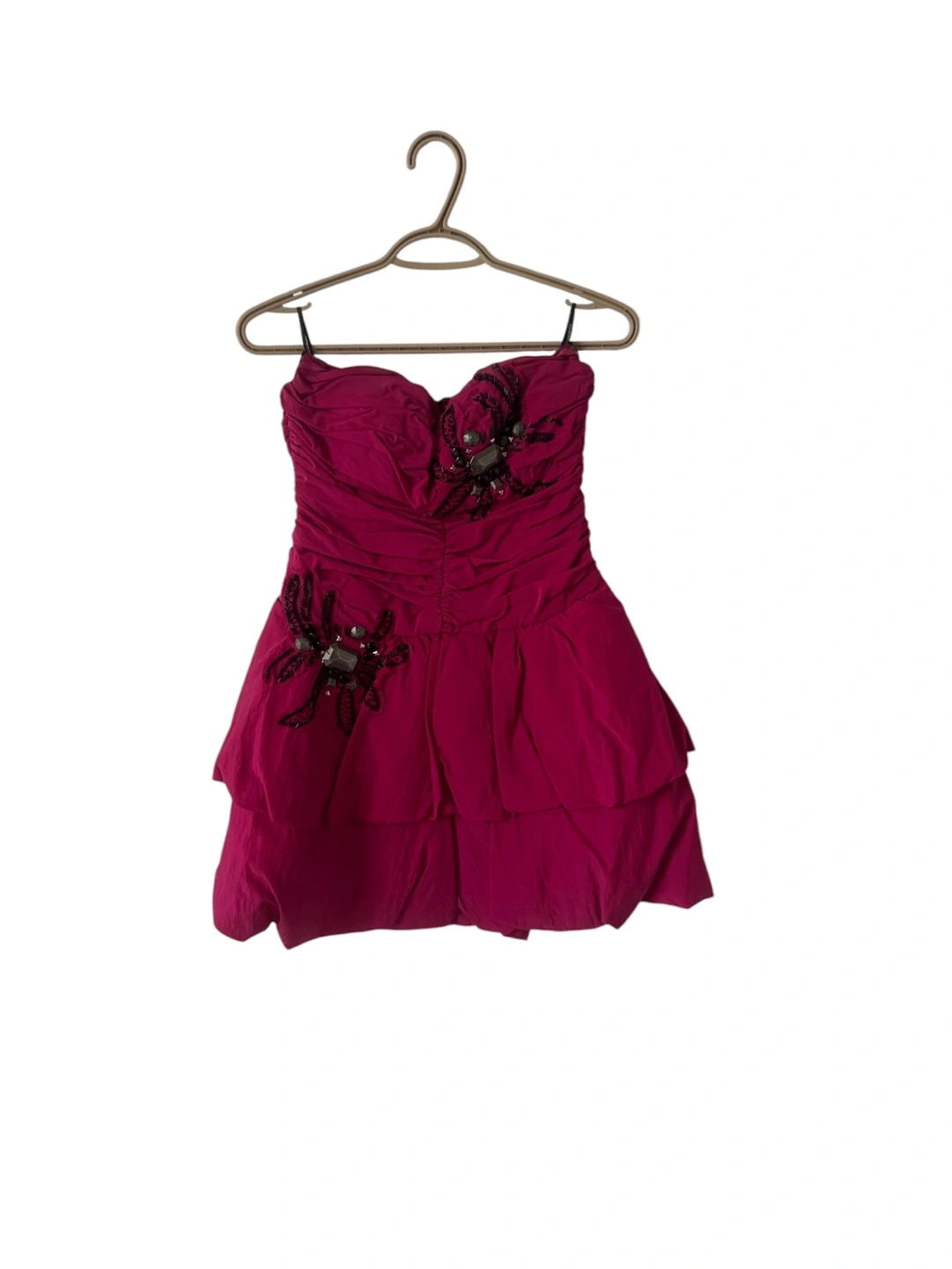Beautiful fuchsia mini dress. Strapless, ruched bodice. Features embellishments. Size XS. Back zipper.