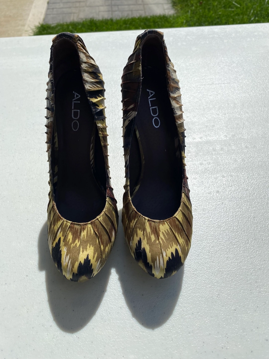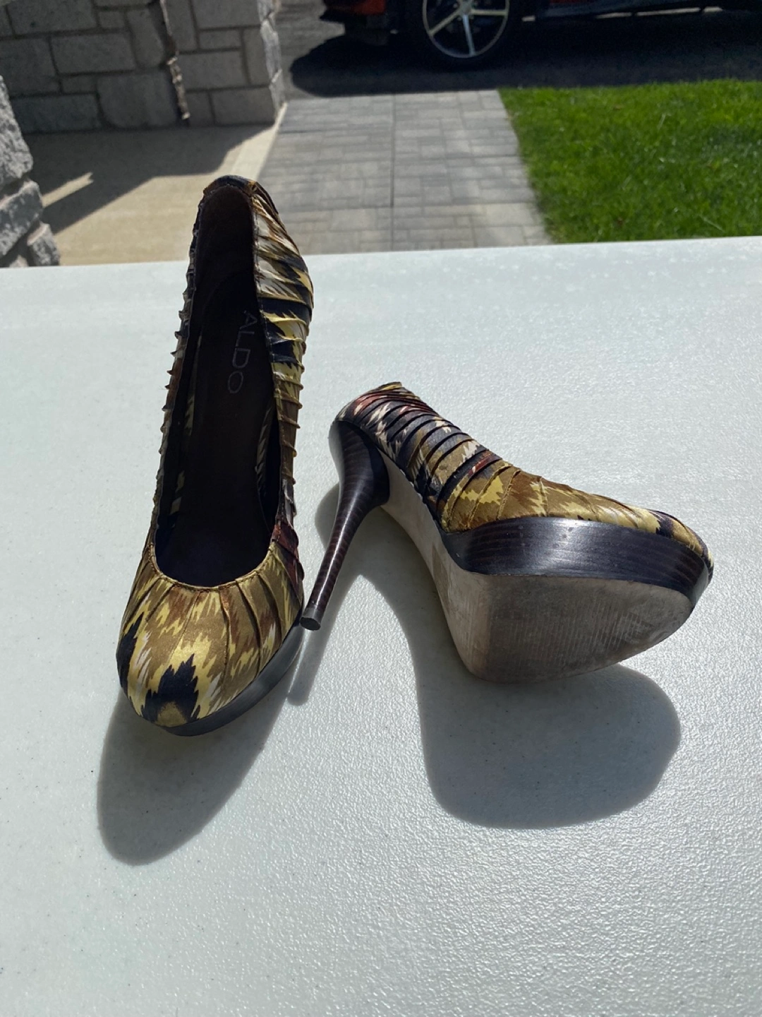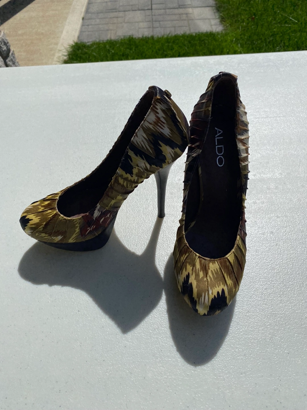 Stylish high heels. Brown, green, and beige patterned fabric upper. High stiletto heel. Platform sole. Great for a night out.