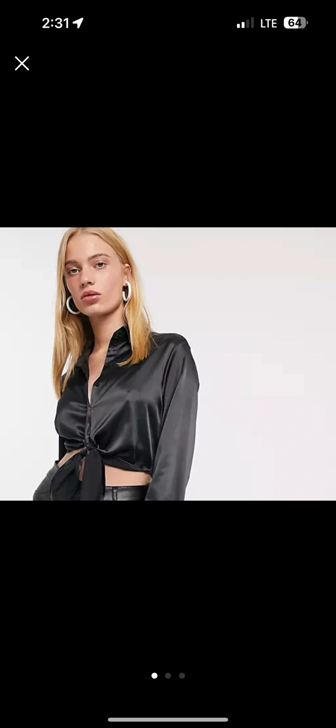 Long sleeve black satin blouse. Features a tie front detail. Size small.